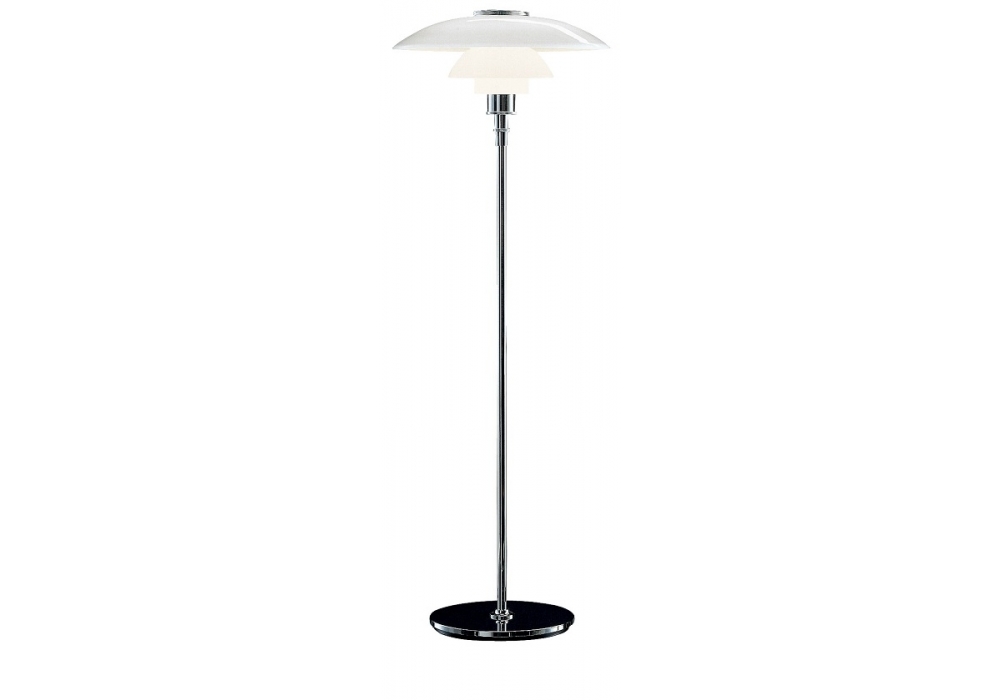 PH 4½-3½ Glass designed by Poul Henningsen for Louis Poulsen is a floor lamp with circular base in spun brass and tubular steel rod, both chromed. The diffusers are in white opal glass and shield a LED or halogen light source with E27 fitting.