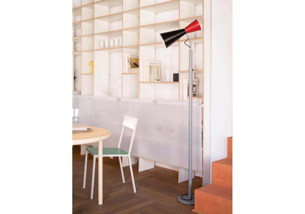 Parliament designed by Le Corbusier for Nemo is a double emission floor lamp with circular base and tubular rod in matt gray painted aluminium. The diffuser is made up of two opposing aluminum cones and houses two dimmable halogen or LED light sources. Parliament is available in different finishes.