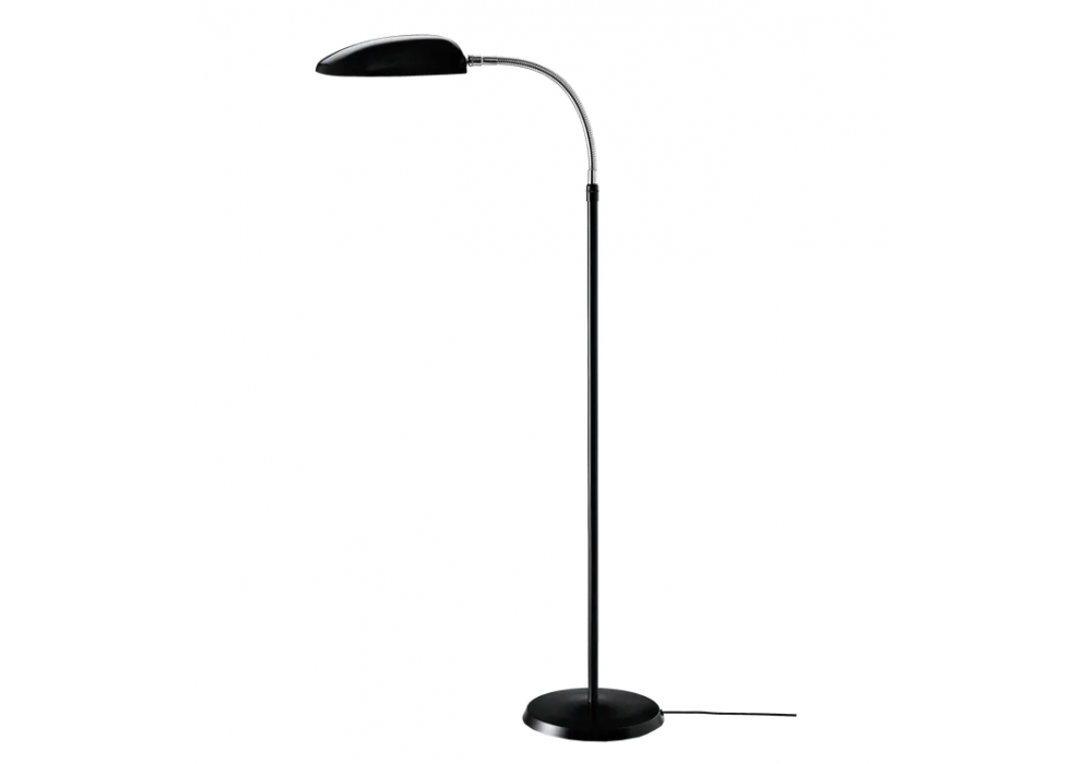 Cobra designed by Greta M. Grossman for Gubi is a floor lamp with powder coated aluminum base. The flexible tubular arm can be bent in all directions and rotated 360°. Semi matt black finish.