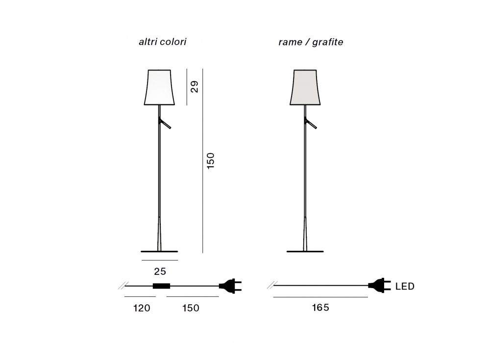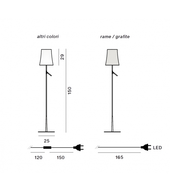 Birdie designed by Ludovica and Roberto Palomba for Foscarini is a floor lamp structured by the combination of liquid painted ABS, polycarbonate and steel. The light source adopted is of the LED type in the on/off or touch dimmer version. Birdie is available in different finishes and sizes.