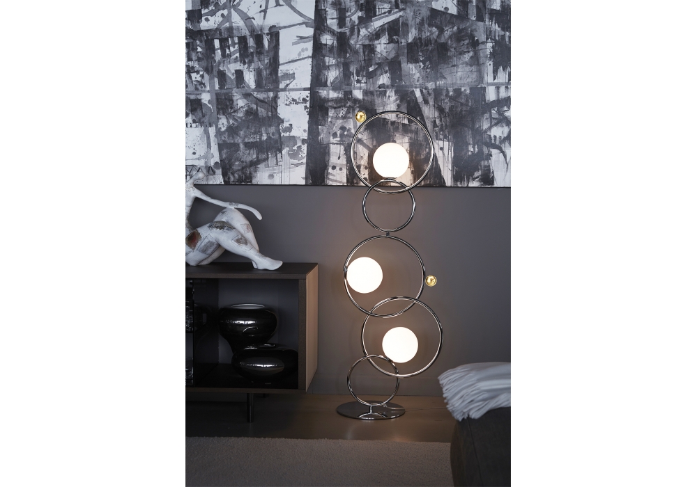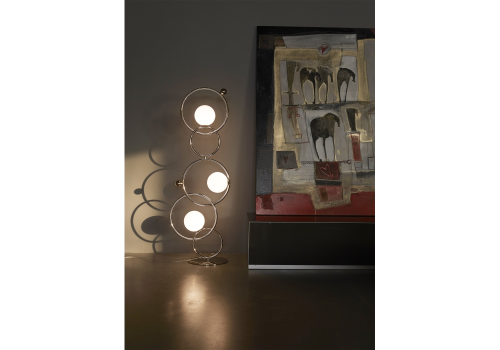 Zoe Floor designed by Melissa Lunardi and Massimo Tonetto for Venicem is a beautiful floor lamp made of metal rings with mouth-blown Murano glass diffusers. This product is available in two different finishes.