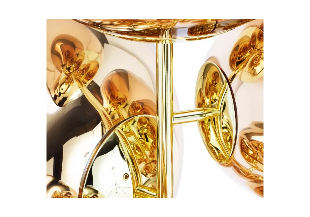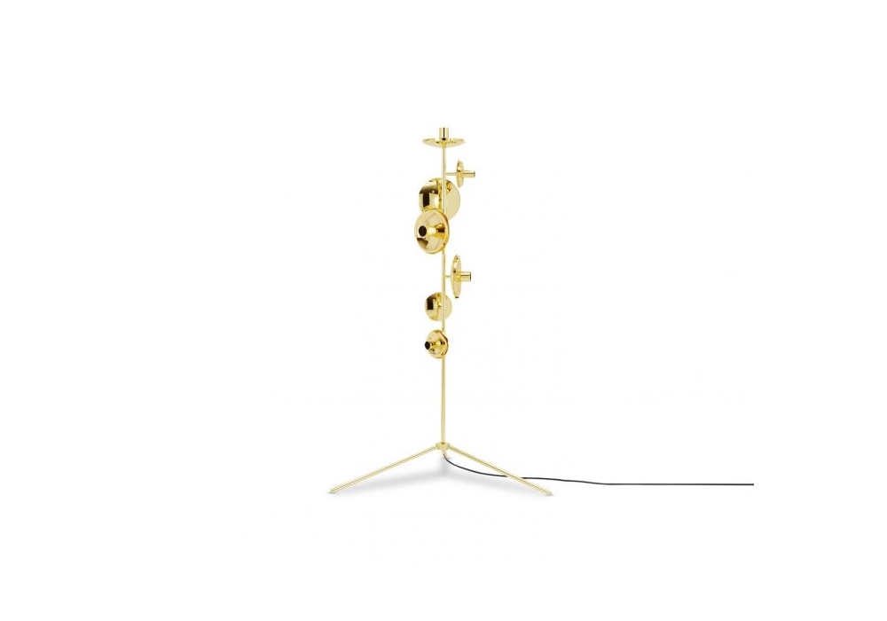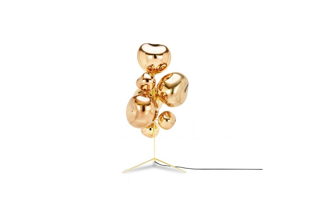 Melt Floor Chandelier designed by Tom Dixon is a floor lamp made of polycarbonate and steel with a glossy finish. A series of distorted spheres. Tripod made of golden metal, supports a maximum of seven spheres. Black braided cable, foot switch.