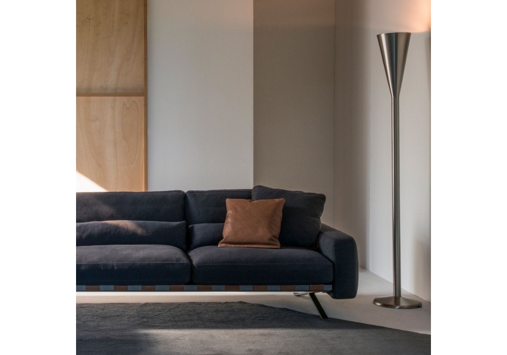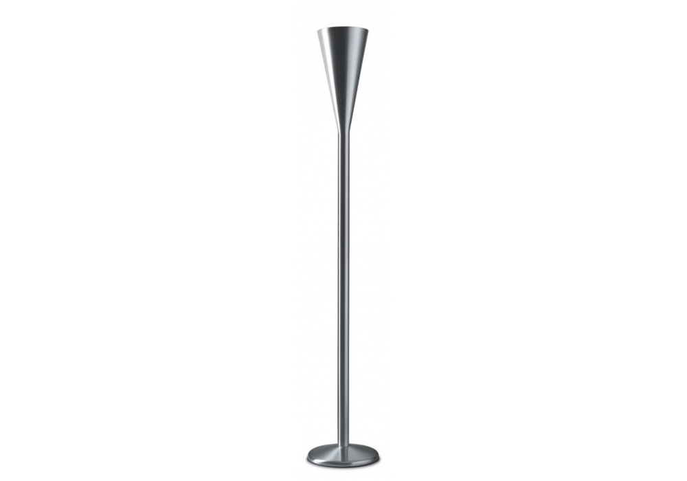 Luminator LED designed by Pietro Chiesa for Fontana Arte is a floor lamp giving indirect light that can be dimmed with a button. Structure in satin nickel-plated metal or satin metal. Black power cord, dimmer and plug. Available in different finishes.
