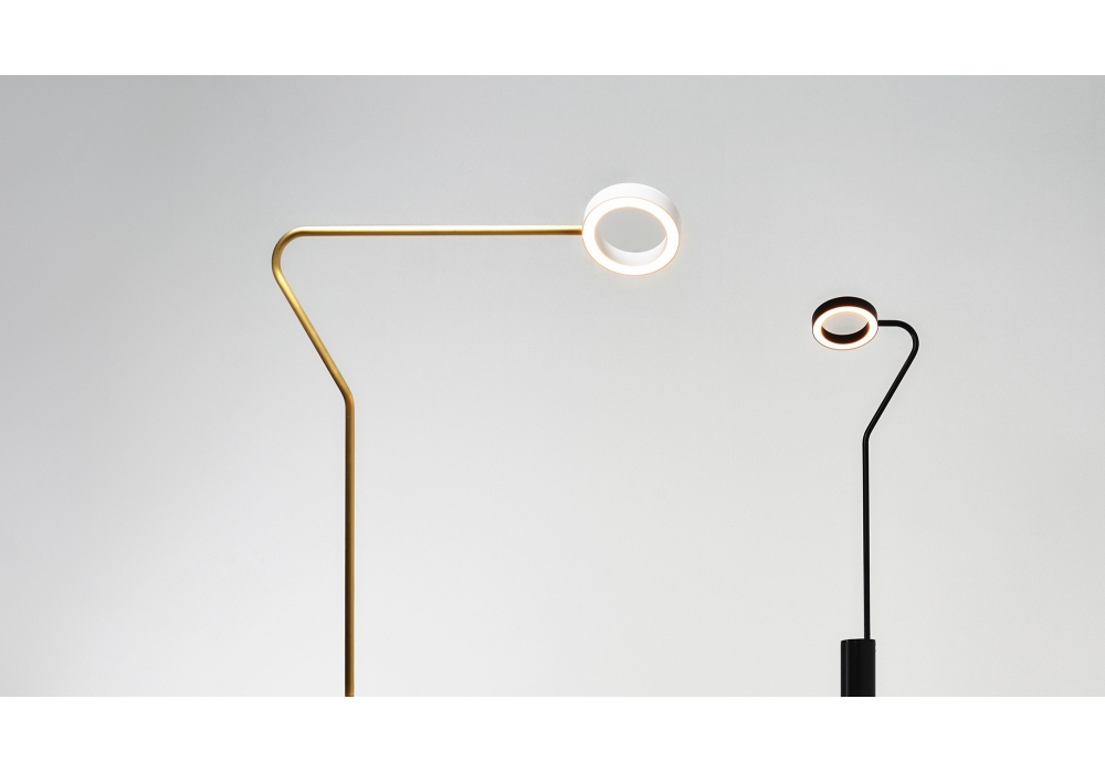 Meta designed by Franco Zavarise for Zava is a floor lamp made of iron, brass and aluminum formed by a circular disk, a ring and a cylinder joined together by a tubular arm bent at a right angle, painted or in satin brass. Available in different finishes and dimensions.