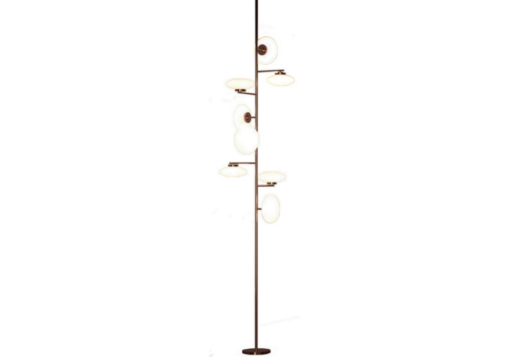 Mamì designed by Umberto Asnago for Penta is an extendable floor/ceiling lamp with structure in matt graphite or brushed bronze metal. The circular diffusers are in white blown glass and shield a dimmable LED light source. Mamì is available in different sizes.