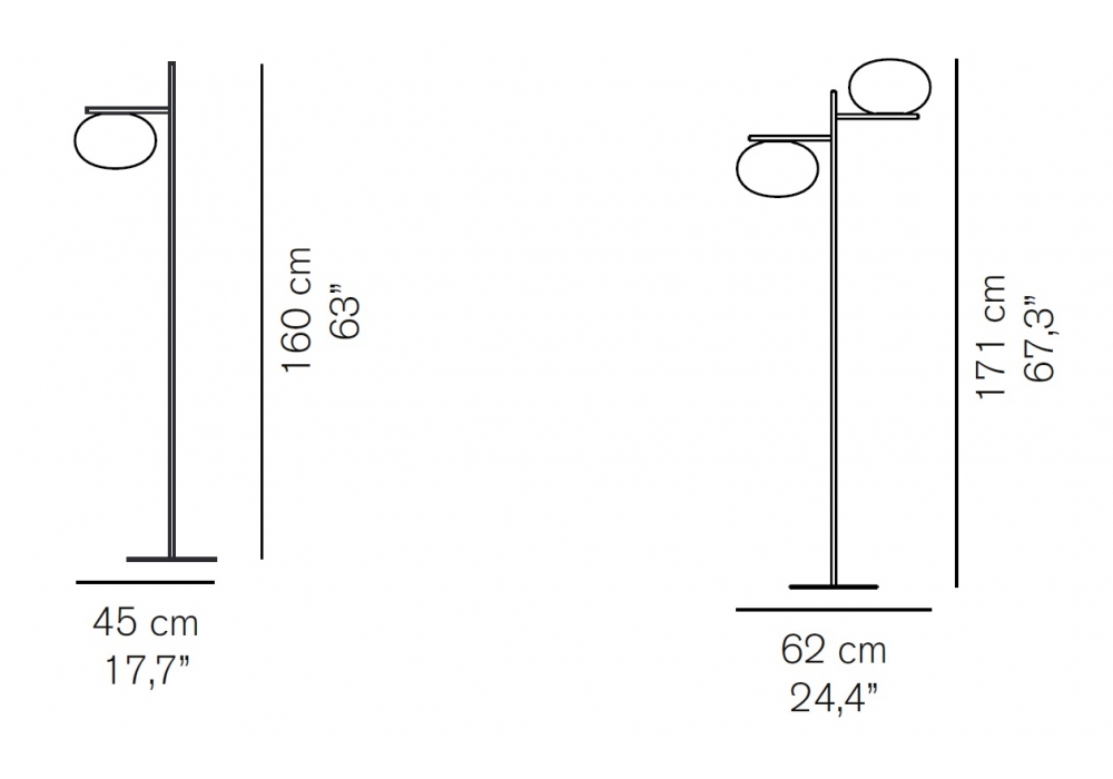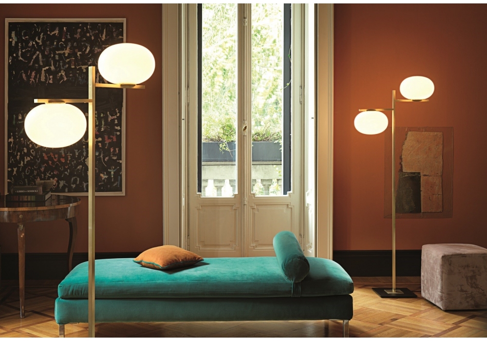 Alba designed by Mariana Pellegrino Soto for Oluce is a floor lamp, in two versions, both resting on an anthracite-colored base from which a rectangular section stem in satin brass finish flows. From the upper end branch, in the first one arm under which the sphere is suspended, in the second, two arms at different heights, which support the luminous drops.