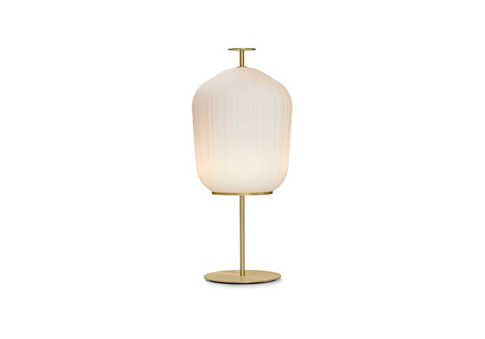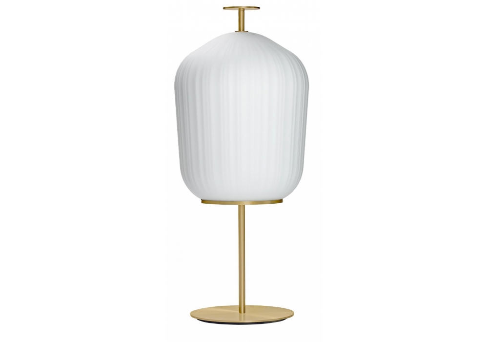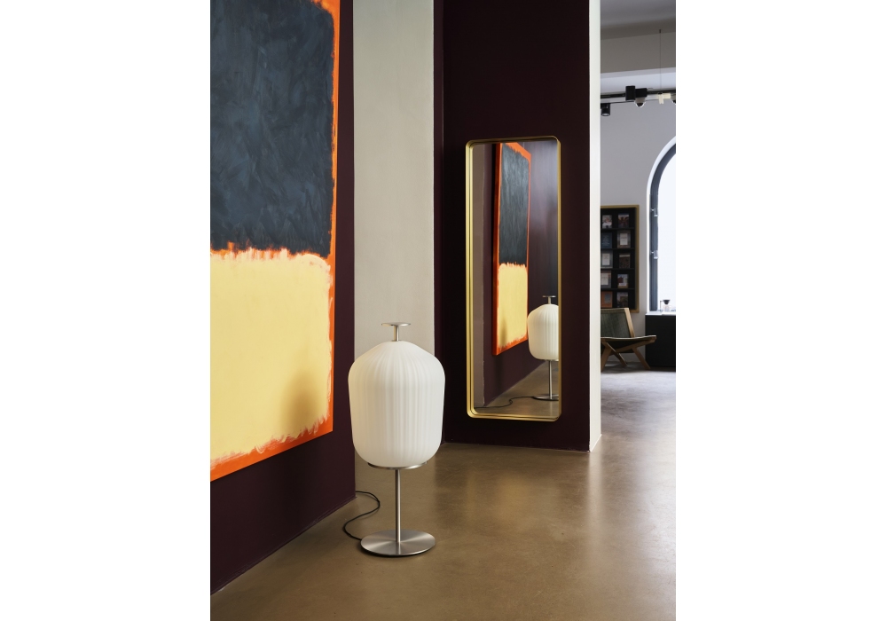 Plissée designed by Sebastian Herkner for ClassiCon is a floor lamp made with an aluminum frame. Hand-blown white satin opal glass shade with pleated surface. Push switch integrated into the upper part of the frame. Black felt gliders.