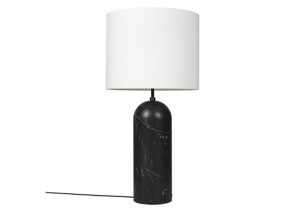 Gravity XL designed by Space Copenhagen for Gubi is a floor lamp composed of marble base and canvas lampshade. It is available in two sizes and in different finishes.