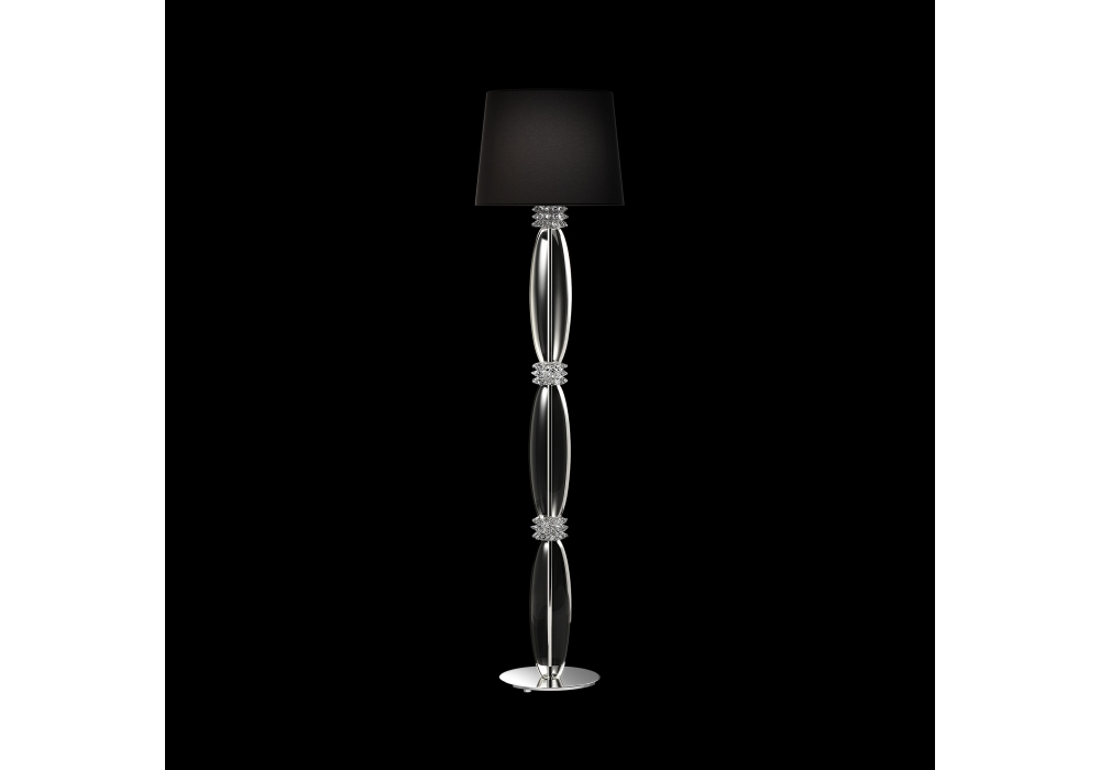 Rotterdam designed and produced by Barovier & Toso is a floor lamp with a circular base in polished chrome, black chrome or galvanized gold colored metal. The lamp body has a tubular metal core covered in Venetian glass with crystal decorations. The lampshade is in fabric and shields a dimmable LED or halogen light source. Rotterdam is available in different finishes.