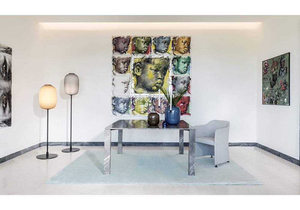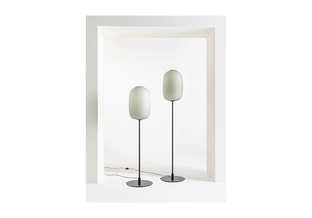 Arya designed by Giulio Cappellini & Antonio Facco for Cappellini is a floor lamp made with plate and tube in matt black painted metal and diffuser in colored matt glass. Available in different finishes and dimensions.