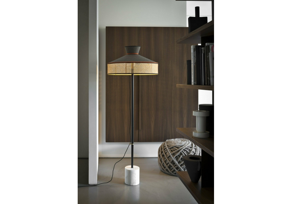 Wagasa designed by Gebrüder Thonet Vienna is a floor lamp with base in Carrara marble and stem in black lacquered beech wood. Fabric lampshade, available in different versions. Vienna straw inserts.