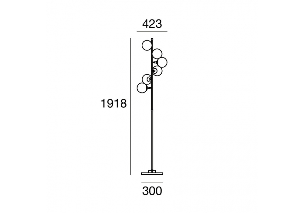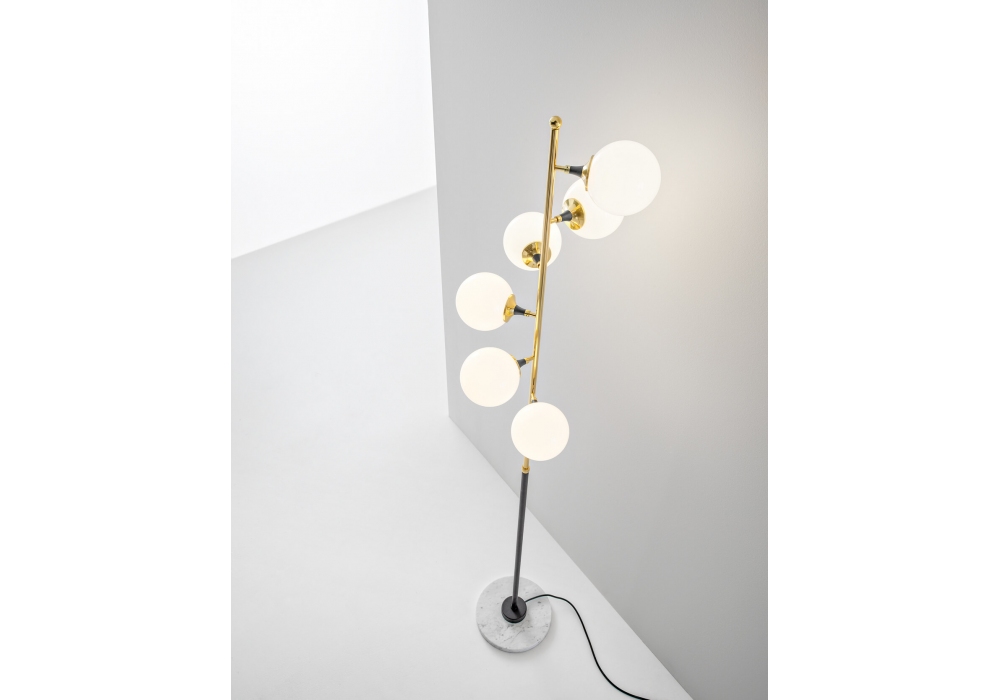 Galassia designed and produced by Stilnovo is a LED floor lamp structured by the combination of metal, marble and glass. The base is circular in white Carrara marble with a lamp body in black metal/brass and galvanic gilding. The diffusers are spherical in white triplex glass.