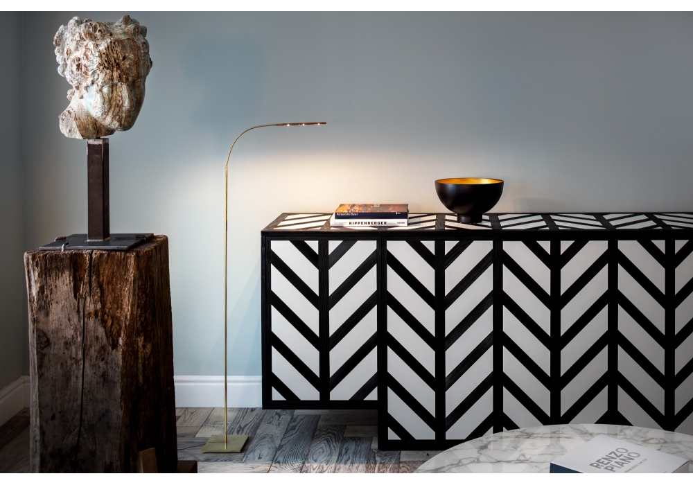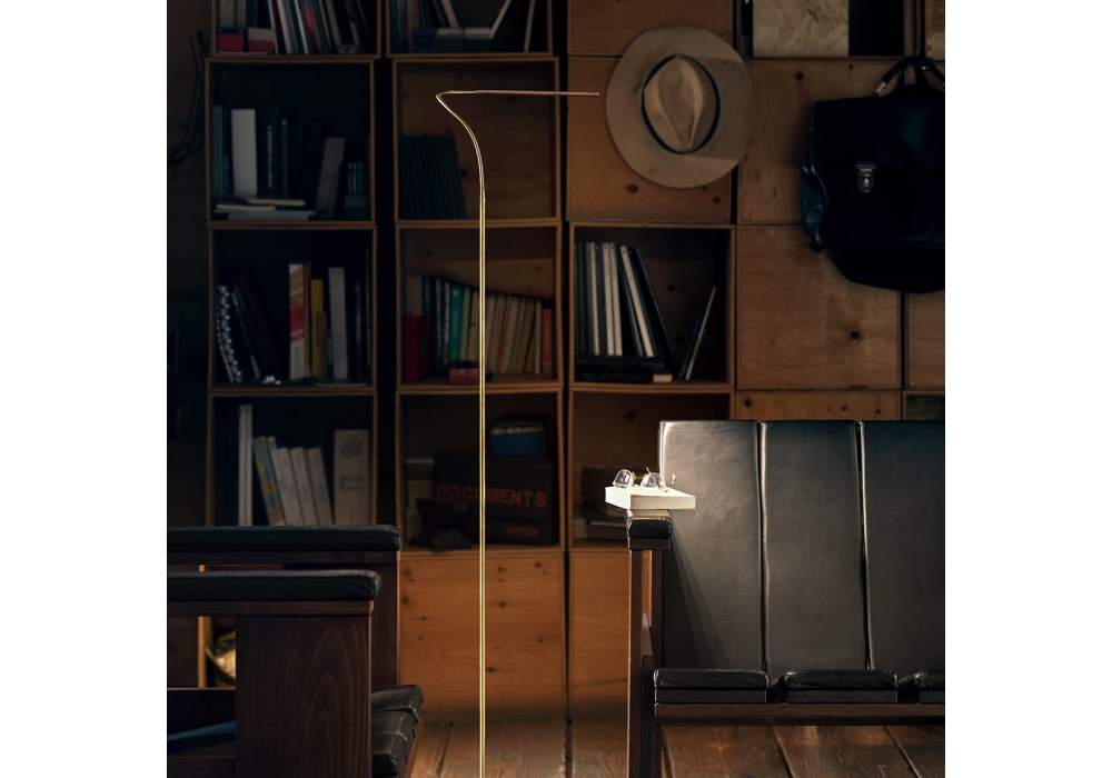 Lola F designed and produced by Catellani & Smith is a LED floor lamp, with brass structure and flex, copper rod and black cable.