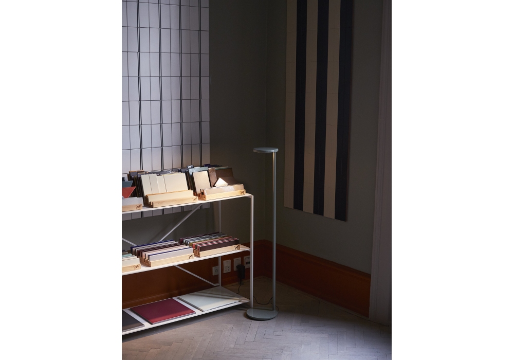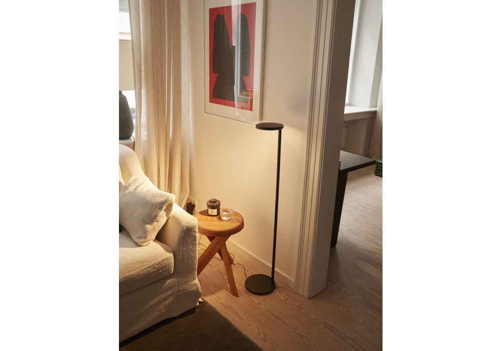 Oblique designed by Vincent Van Duysen for Flos is a floor lamp with a circular base and a vertical rod entirely structured in painted aluminum. The diffuser has an oblique inclination and shields a dimmable LED light source included. Oblique is available in different finishes and light source gradations.