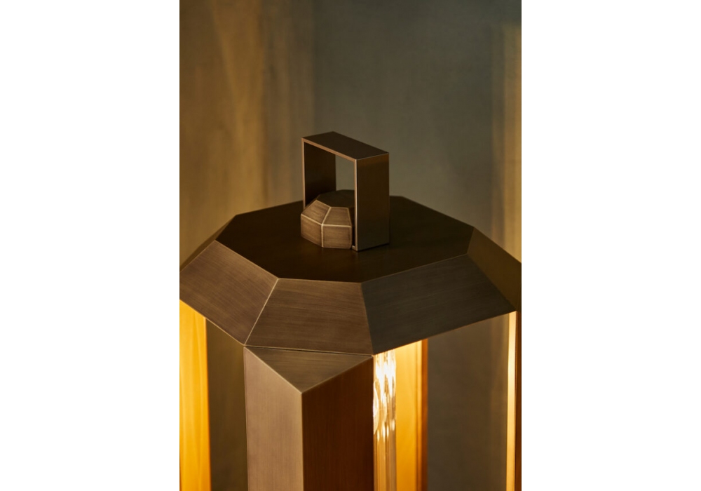 Cube designed by Massimiliano Riggi is a lantern with an external structure in composite material finished in bronze using new painting techniques with metal powders. The internal part of the lantern is made of gold painted metal with a ribbed plexiglass diffuser and adopts a light source with an E27 LED socket and a pedal dimmability system. Cube is available in different sizes.