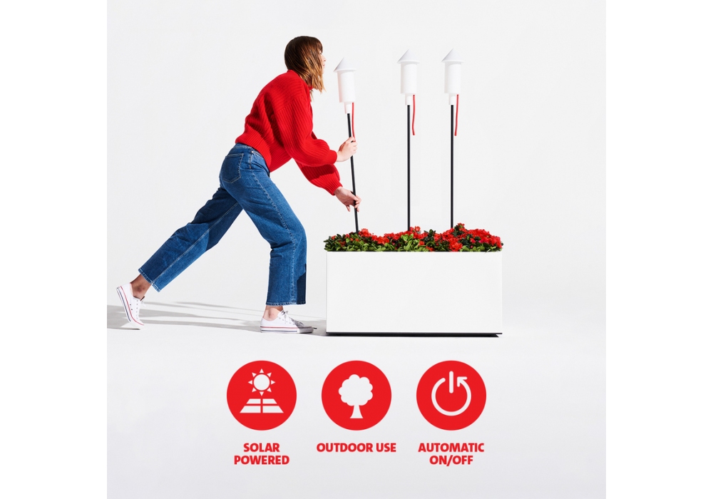 Prêt a Racket designed by Fatboy is a 3-piece set of floor lamps that turn on by themselves when it gets dark and turn off. Fully solar powered, therefore easy to use. The lamps offer a cozy atmosphere because they emit a warm light.