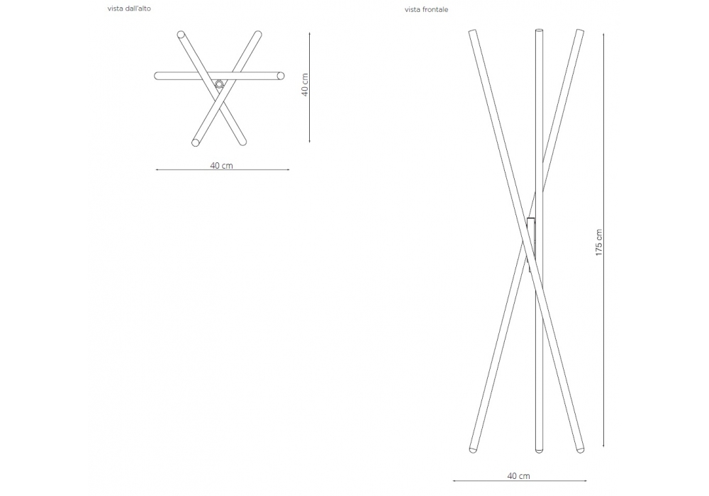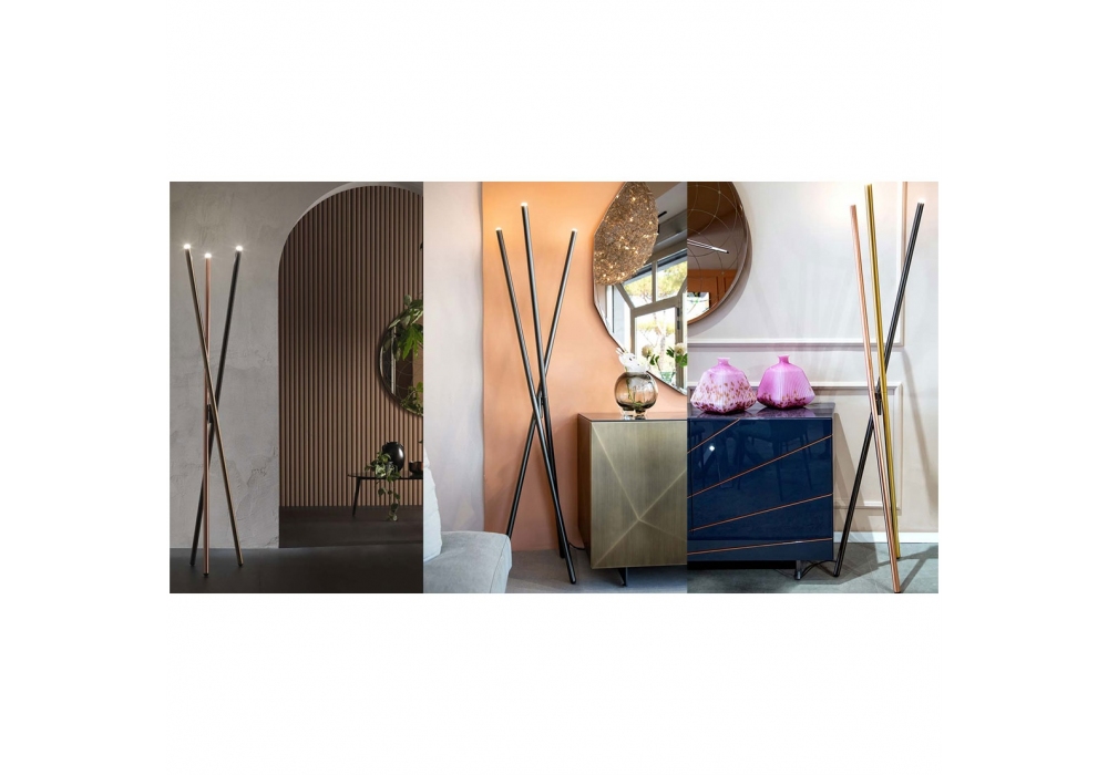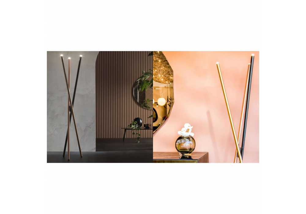 Shangai PT designed by Riflessi is a floor lamp composed of three metal tubes painted with galvanic satin treatment. The lamp consists of three fixed directional LED lights. Electric cable in black fabric.