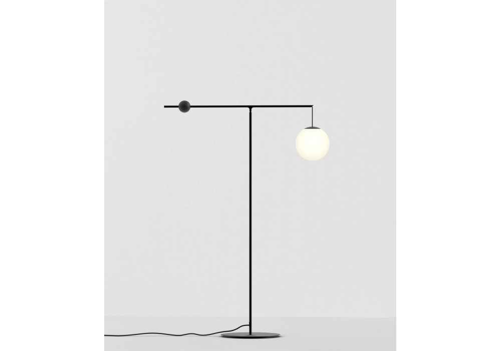 Malamata designed by Shulab for Luceplan is a floor lamp with structure in matt black steel or brushed brass and opal white blown glass diffuser. By pressing the button above the sphere, the counterweight is free to slide on the arm allowing you to change the position of the diffuser.