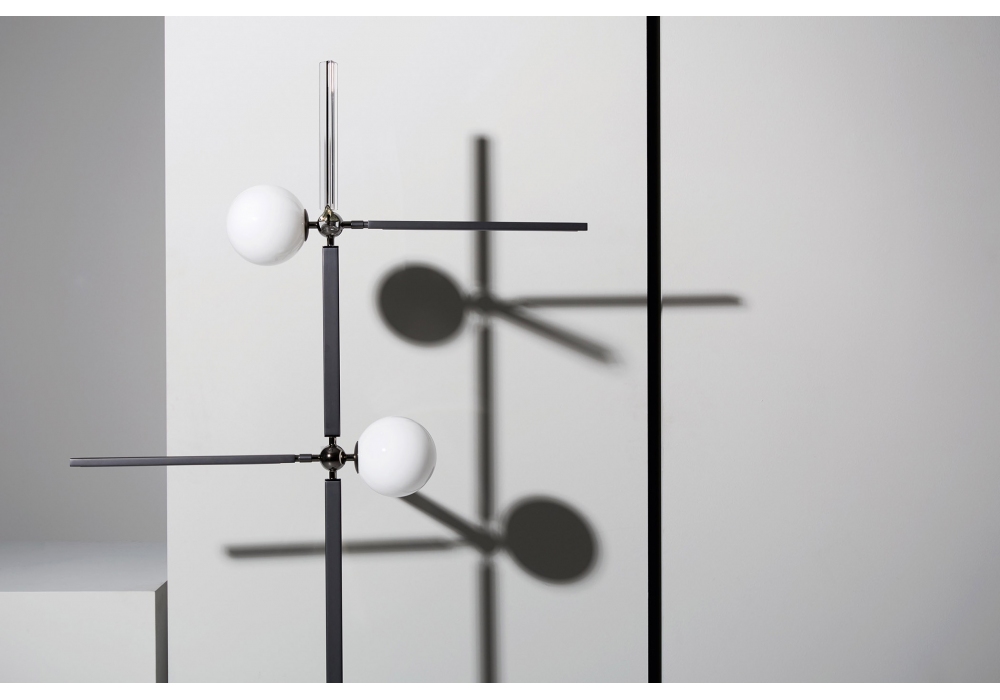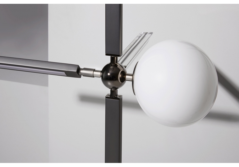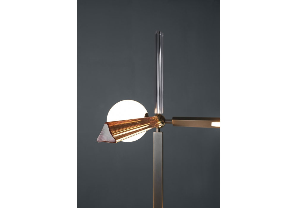 Pinocchio designed by Massimo Tonetto for Venicem is a floor lamp with diffused and direct light. Dark burnished brass structure with shiny gold metal spheres or matt black nickel structure with shiny black nickel metal spheres. White blown Murano glass diffusers and Murano blown glass trihedrons in crystal, smoked or amber.
