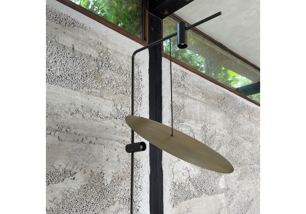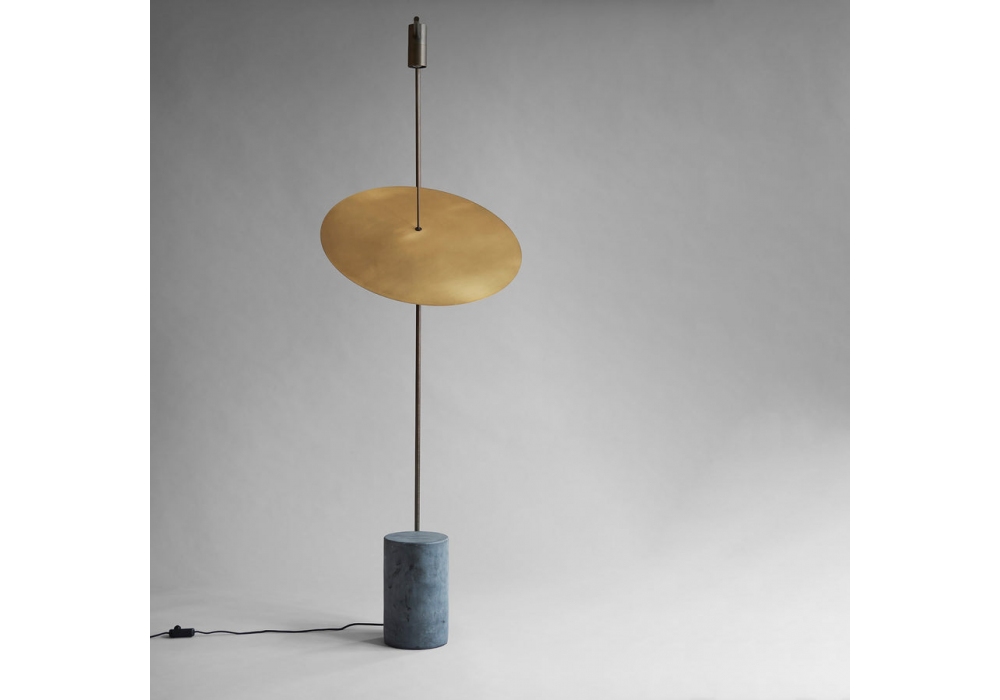 The Moon designed by Kristian Sofus Hansen & Tommy Hyldahl for 101 Copenhagen is a floor lamp characterized by a brushed brass lampshade, an oxidized brass arm and a cylindrical base in unpolished gray marble. The lamp has two light sources.