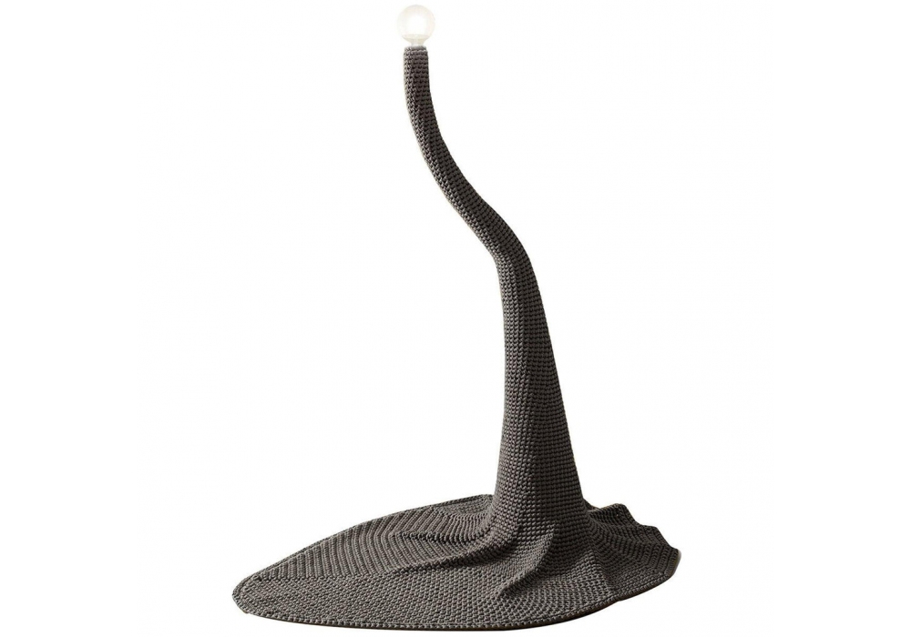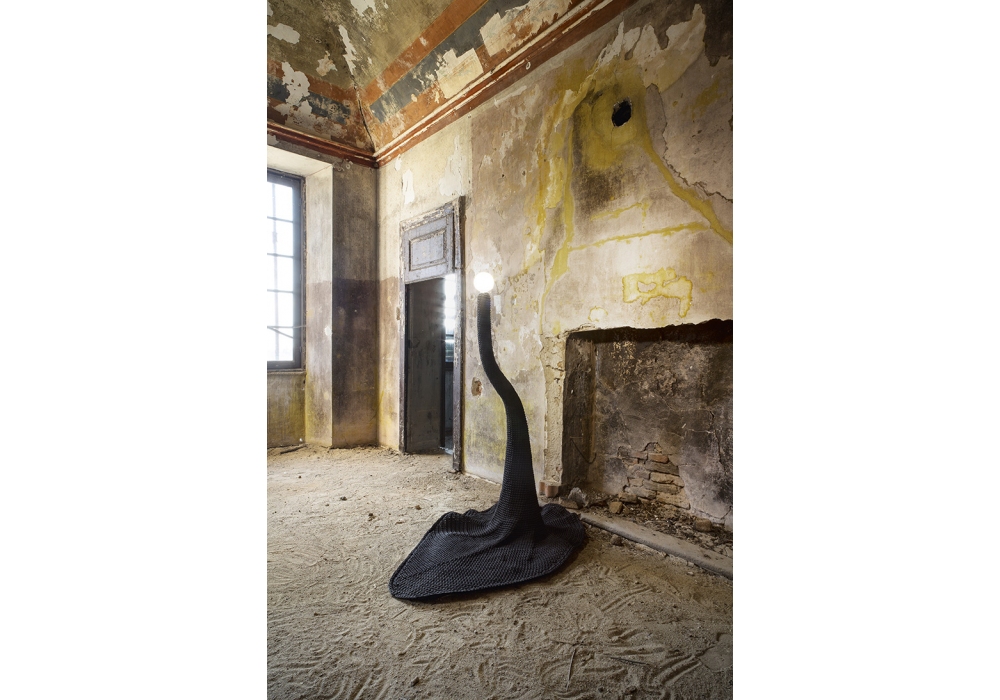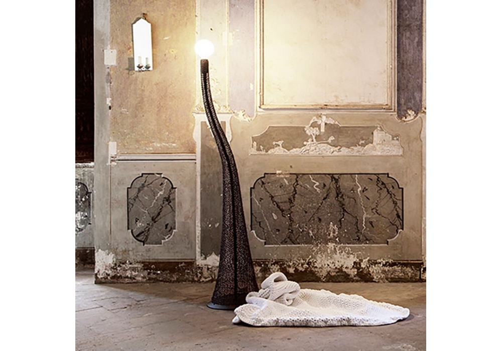 Penelope designed by Domenico Rinaldi for Fisionarte is a floor lamp with supporting structure in black painted hand-woven metal mesh. Upholstery in fire retardant crocheted fabric. Penelope is available in different finishes and with or without light source.