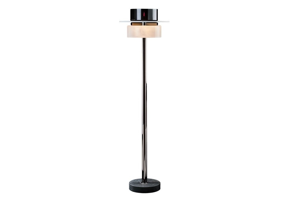 Ratrih designed by Ettore Sottsass for Venini is a floor lamp with milky glass blown glass diffuser and black marble base. Edition numbered by year.