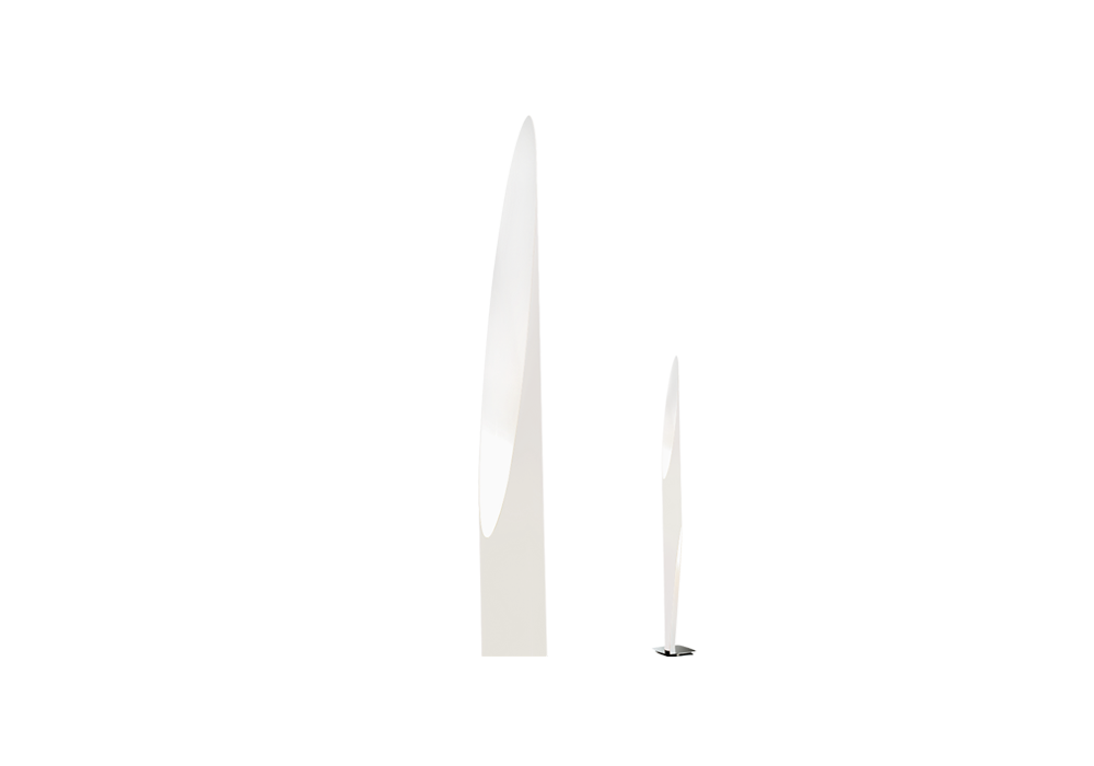 Shakti designed by Marzio Rusconi Clerici for Kundalini is a dimmable floor lamp with two lights, reading and ambient, with tubular diffuser in laser-cut white Plexiglas fixed on a satin-finish steel base. Available in different dimensions.