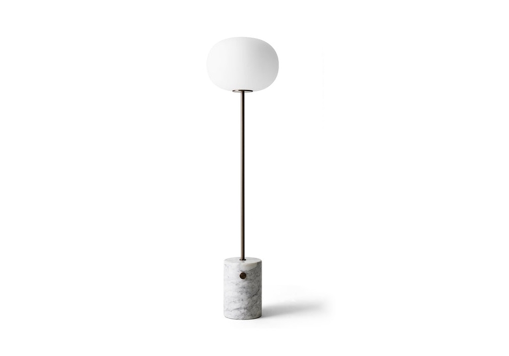 JWDA designed by Jonas Wagell for Audo Copenhagen is a floor lamp with base in travertine and metal parts in brushed brass or in Carrara marble with metal parts in bronzed brass. Lampshade in opal glass.
