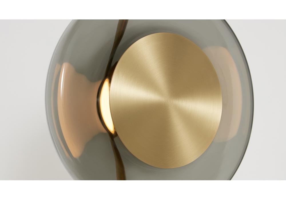 Pendulum designed by CTO Lighting is a LED floor lamp composed of a sculptural stem in brass and based on a solid base in Nero Marquina marble, available with a satin brass or bronze finish. Inside the hand-curved blown glass shade is a nucleus of integrated LED light that can be dimmed.