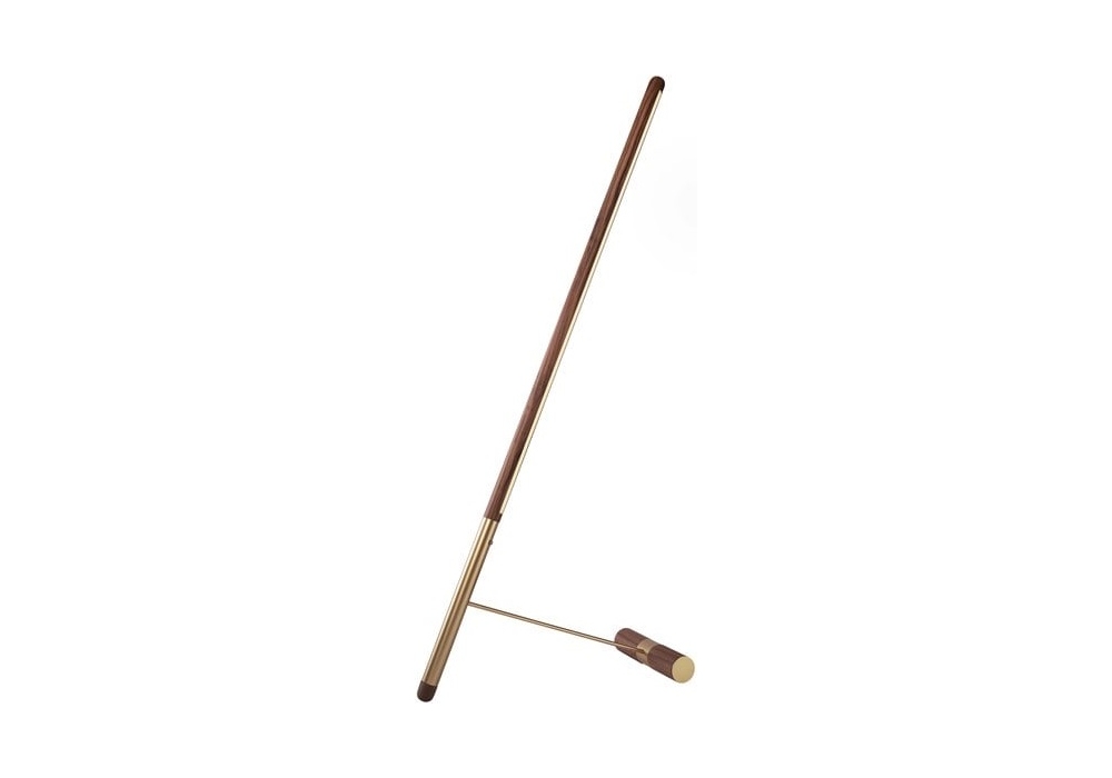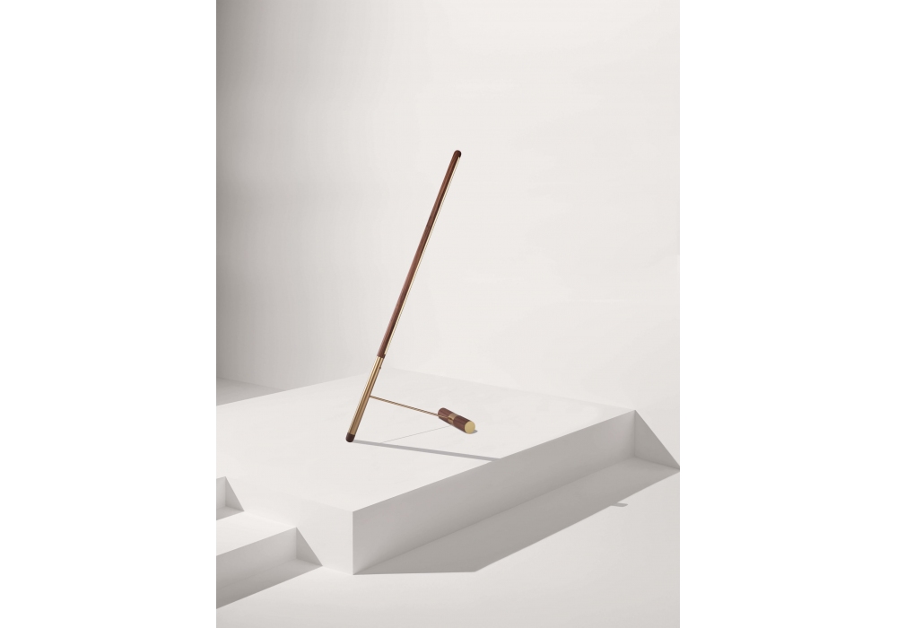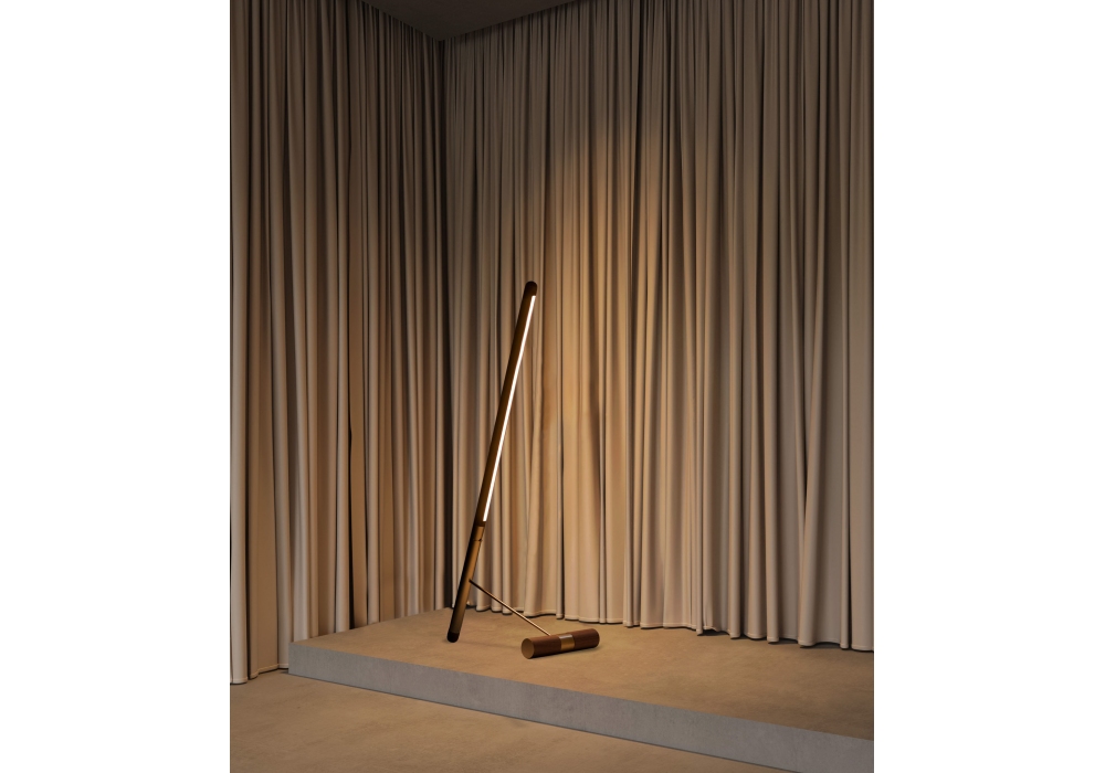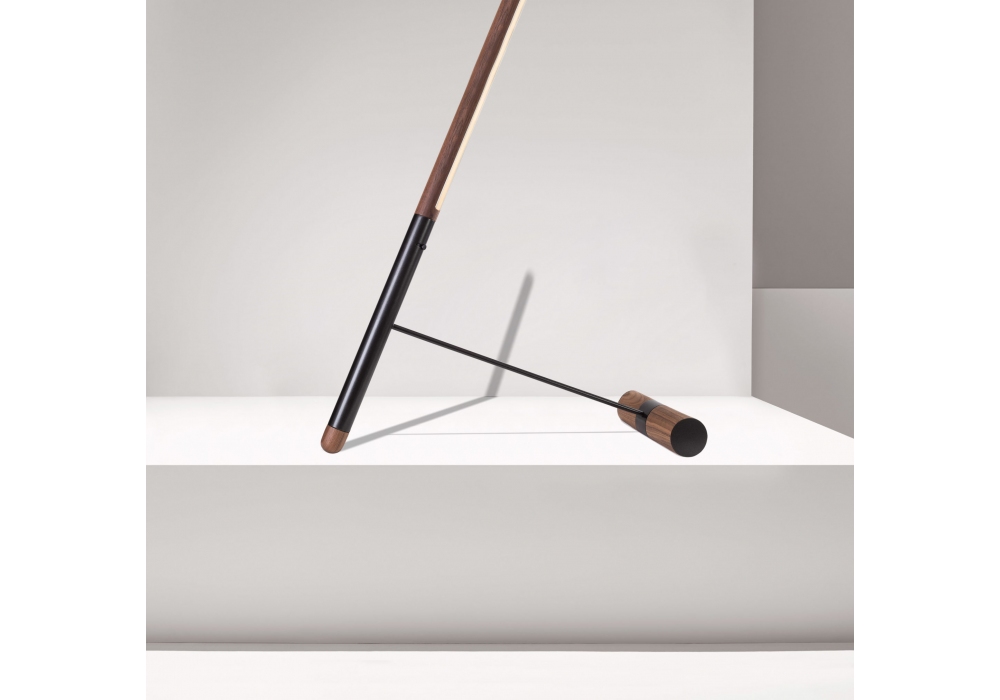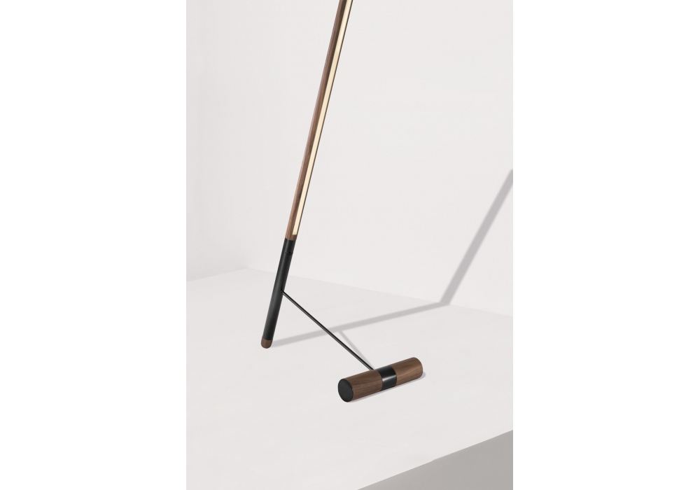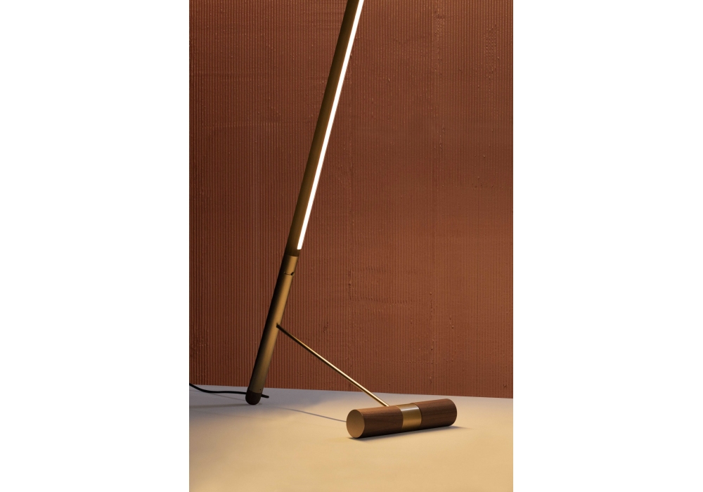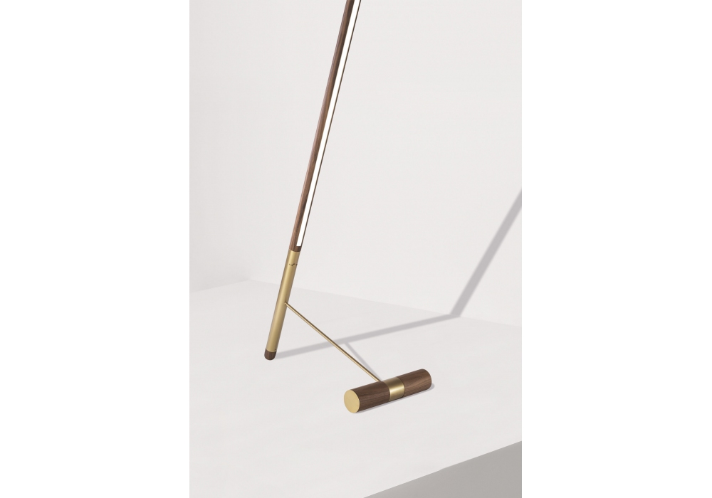 Linea D designed by Andrés Martínez for Nomon is a floor lamp with structure in walnut wood, with details in polished brass or graphite finish metal.