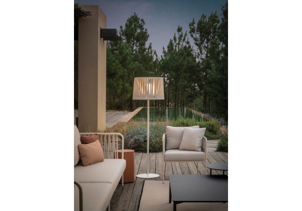 Oh Lamp designed by Studio expormim for Expormim is an outdoor floor lamp with structure finished with polyester powder paint and high resistance woven rope. LED light source. Available in different finishes.