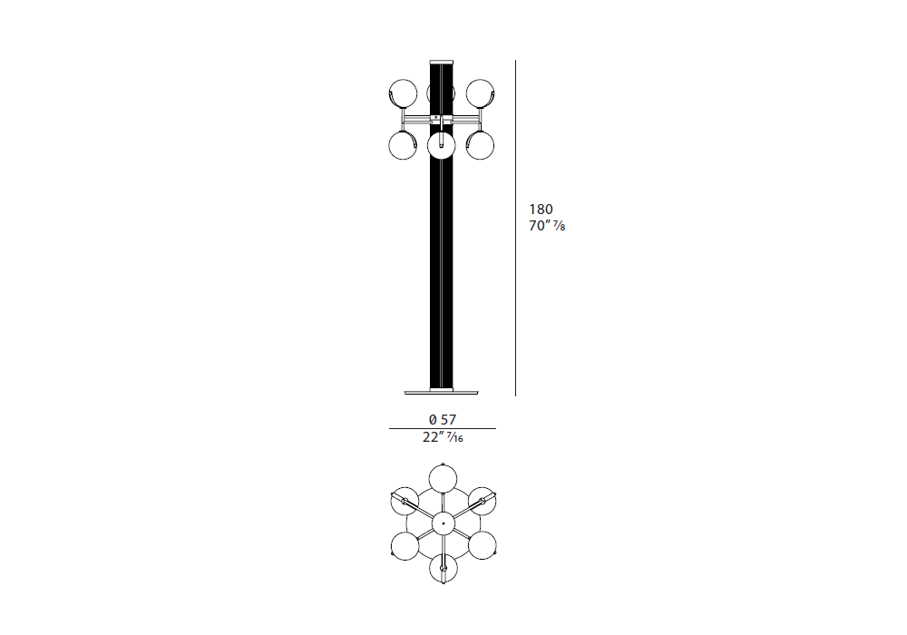 Madison designed by Andrea Bonini for Turri is a floor lamp with a central column in grooved metal which supports satin finish metal arms to which transparent luminous spheres are applied.