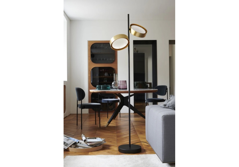 Berlin designed by Christophe Pillet for Oluce is a floor lamp with circular base and painted vertical rod. The diffusers are adjustable in a circular shape in painted metal with wired and sandblasted glass and adopt a dimmable LED light source.