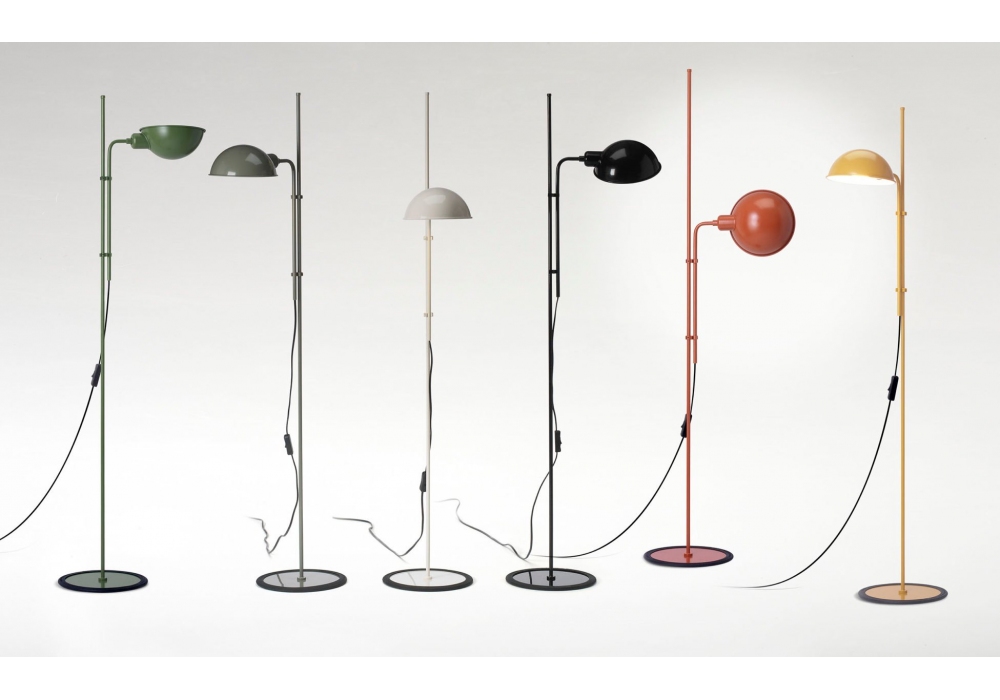 Funiculì designed by Lluís Porqueras for Marset is a floor lamp characterized by a base and stem in lacquered iron and lampshade in lacquered aluminium. Available in different finishes. The base is wrapped in black rubber.