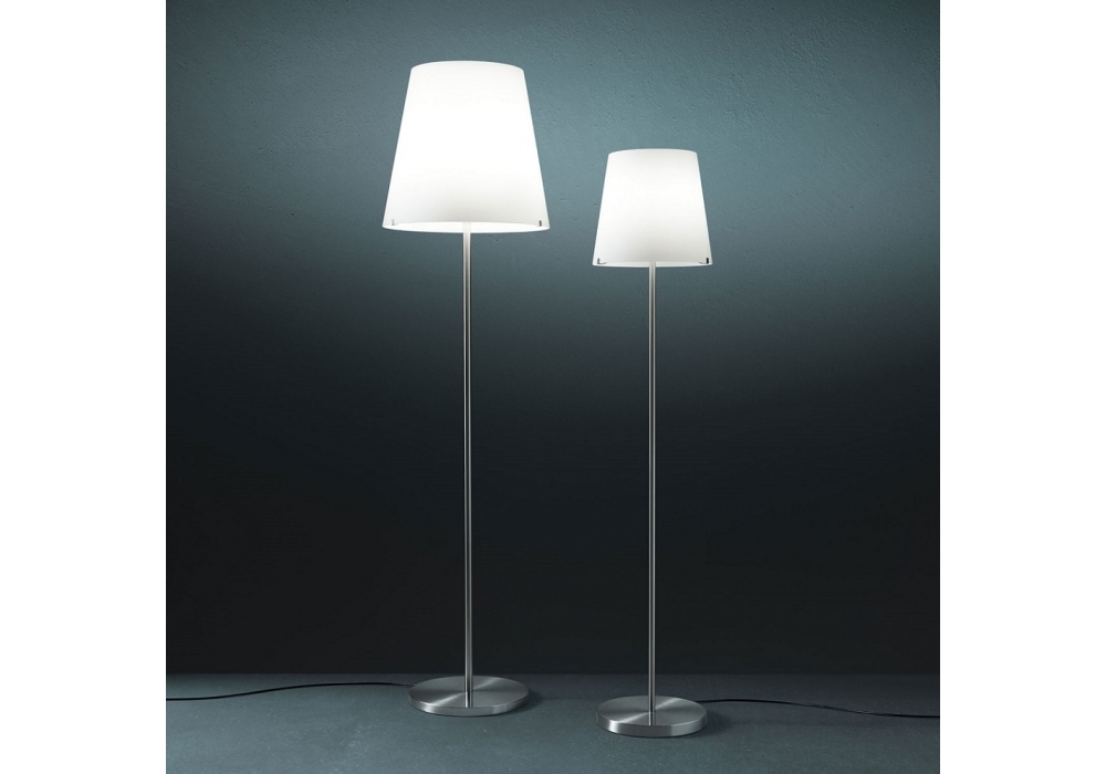 3247 designed and produced by Fontana Arte is a floor lamp with diffused dimmable light or partially dimmable (the large one) with sliding switch. Structure in brushed nickel-plated metal. White satin blown glass diffuser. Black power cord, dimmer and plug.