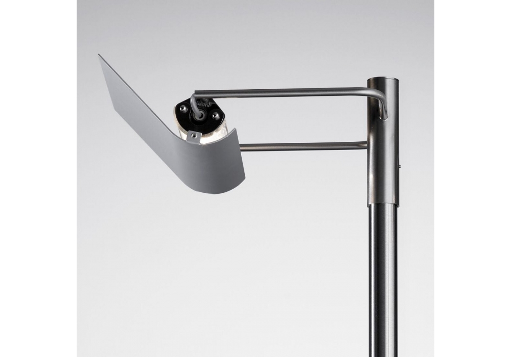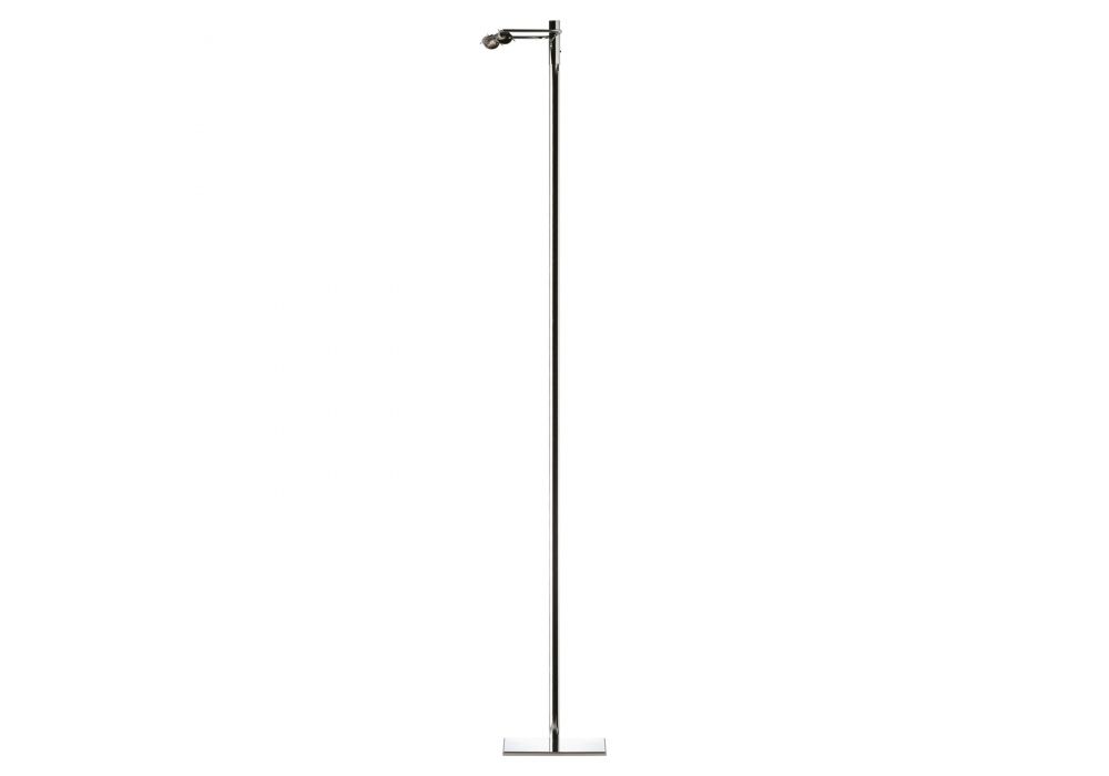 Scintilla designed by Livio Castiglioni, Piero Castiglioni for Fontana Arte is a floor lamp giving indirect directional light, dimmable with sliding switch. Structure in satin nickel-plated metal. Reflector in anodized aluminium. Diffusers in transparent borosilicate glass. Striped power cord, black dimmer and plug. Available in different finishes.