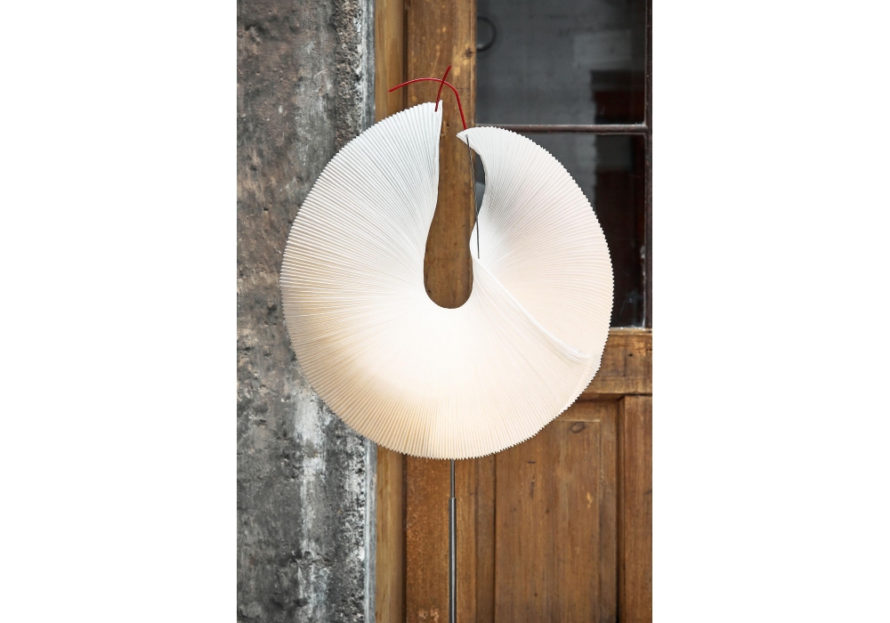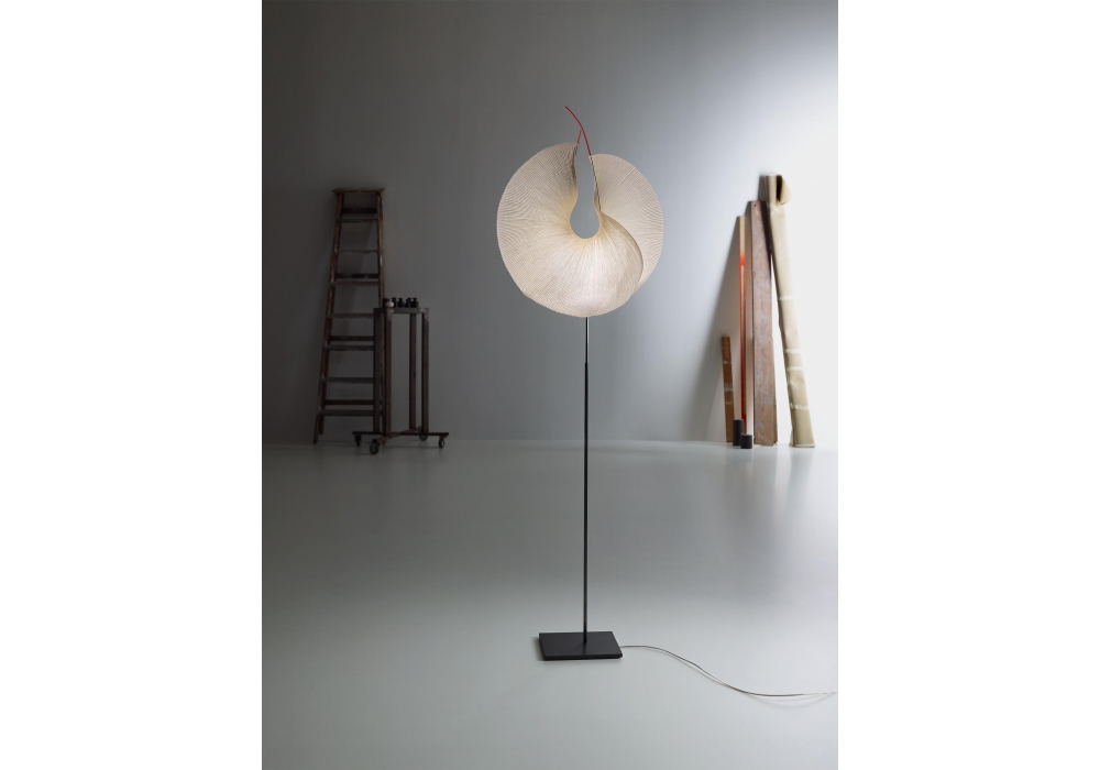 Yoruba Rose designed and produced by Ingo Maurer is a floor lamp with integrated LEDs and dimmer. It consists of a metal base and Japanese paper shade which is stretched in a circular fashion on thin metal wires.