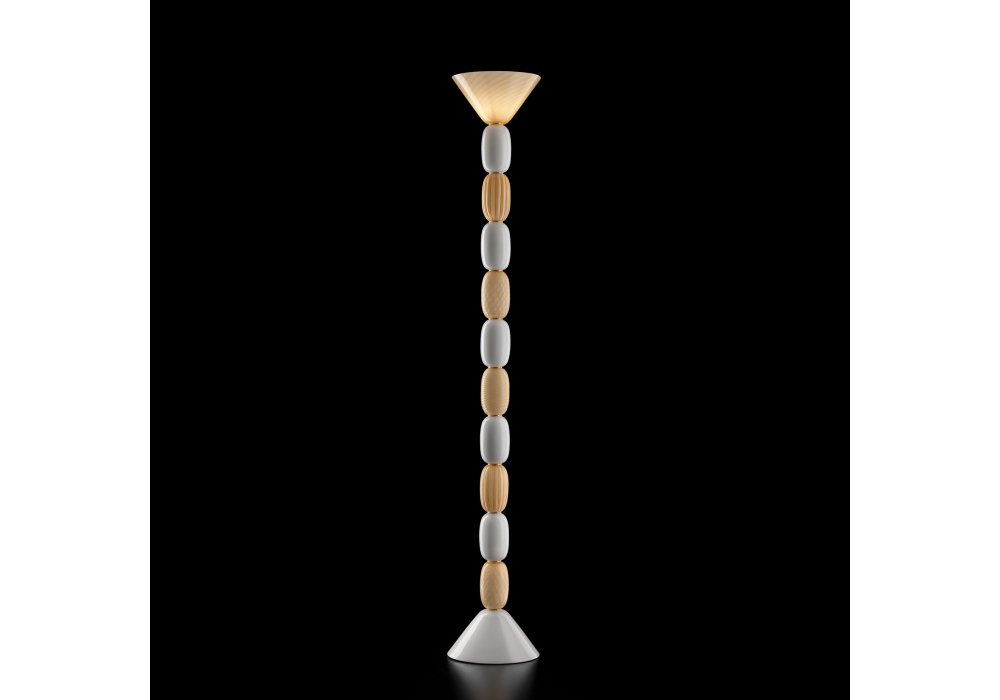 Conterie designed by Luca Nichetto for Barovier & Toso is a floor lamp with conical base in white porcelain and vertical structure in porcelain and Venetian crystal in different textures. The conical diffuser in Murano glass adopts a dimmable LED or halogen light source.