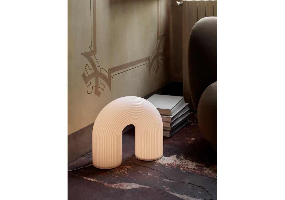 Vuelta designed by Ferm Living is a floor lamp made from opal glass with a rippled surface that lends textural appeal to the piece. Designed with an LED light source that emits a soft, diffused light, it also features an adjustable dimmer switch for ultimate ambiance control.