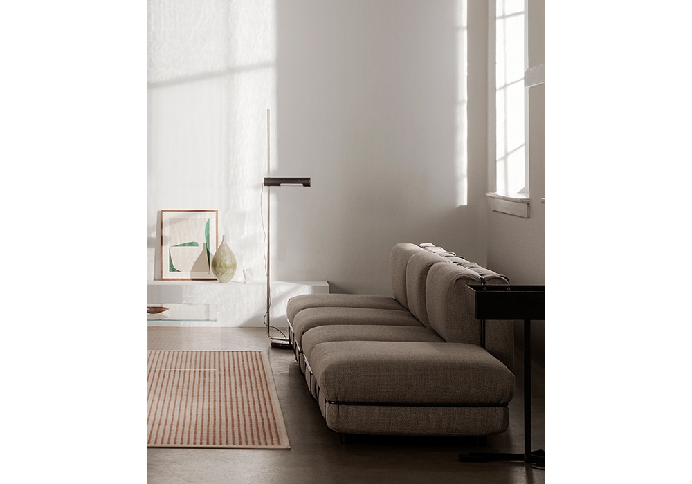 Alola designed by Angelo Mangiarotti for Karakter is a floor lamp made with base in Nero Marquina marble, stem in chromed or powder coated steel, lamp head in powder coated aluminium.