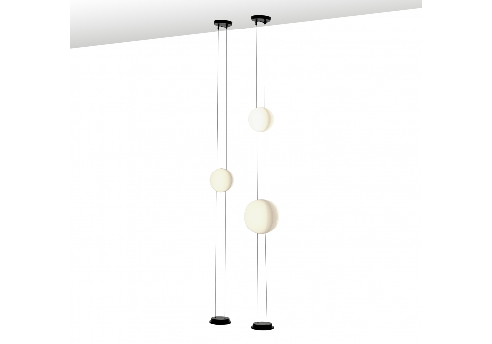 Orbit designed by Marco Cattaneo for Mogg is a dimmable floor-ceiling lamp with spherical diffuser available in 20 and 28 cm diameters that slide on parallel steel cables. Requires ceiling fixing in the desired location. Cable length 400 cm. It is possible to position up to 3 spherical diffusers for each structure. Ground base and ceiling support painted black RAL 9017.