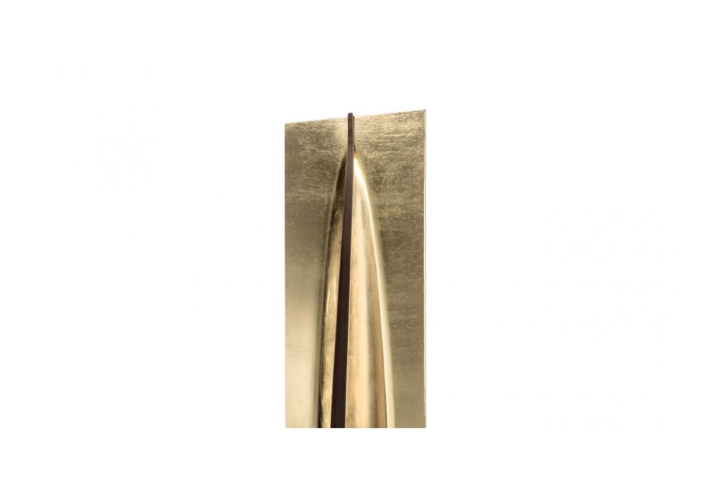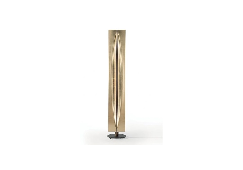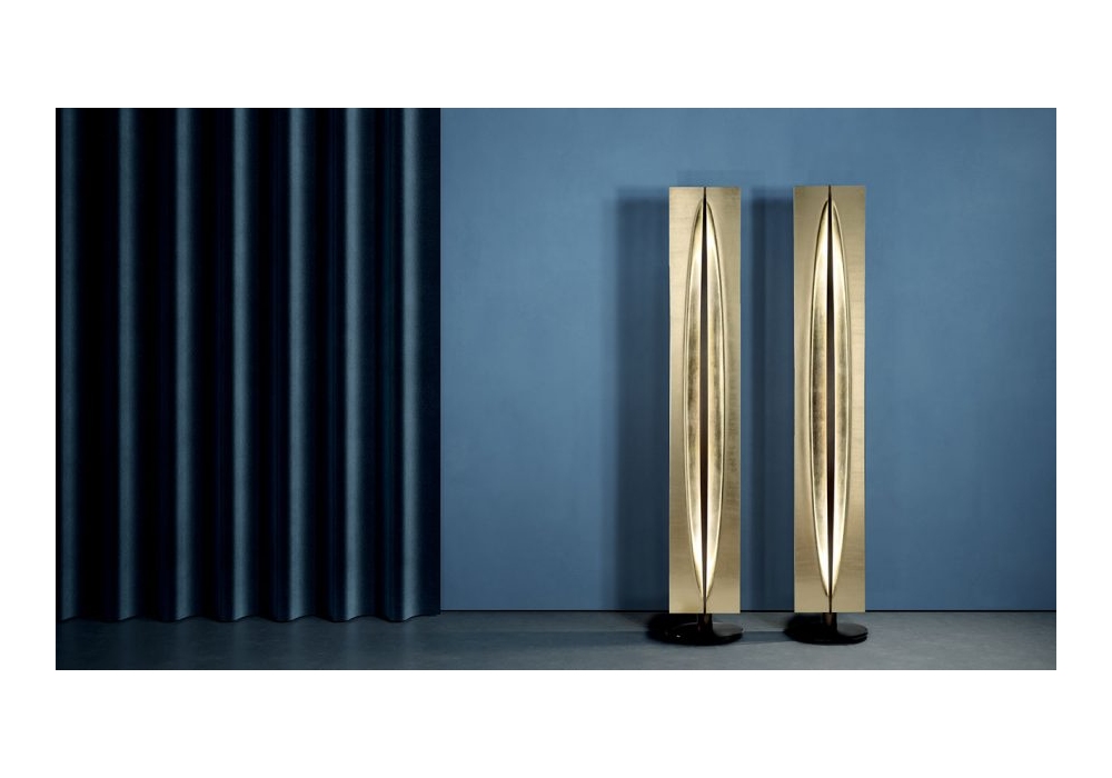 Terra designed by Reflex Angelo is a floor lamp made of extra-clear glass with gold leaf workmanship, rotating on a clay painted acid-etched glass base and with a brass-finish metal structure. Vertical blade in burnished brass.