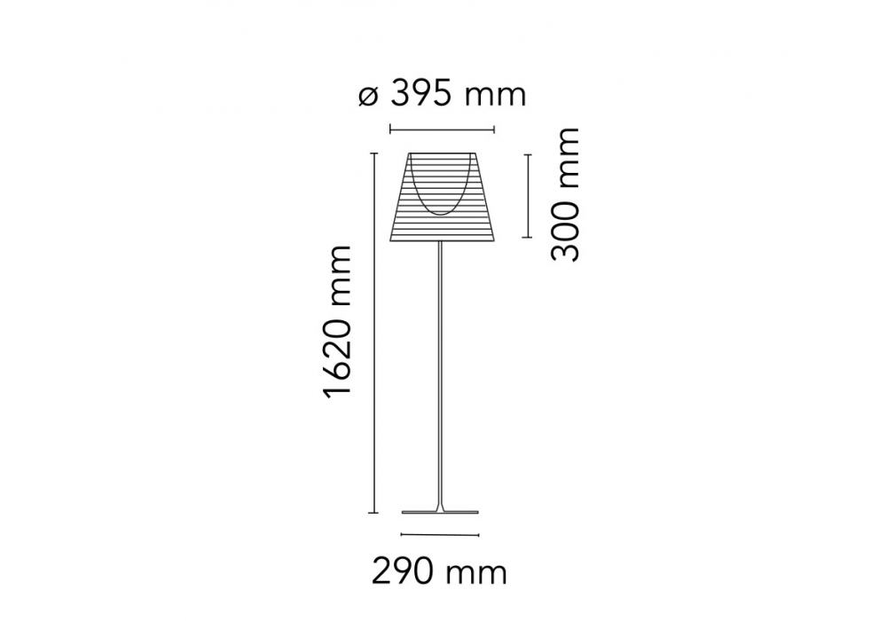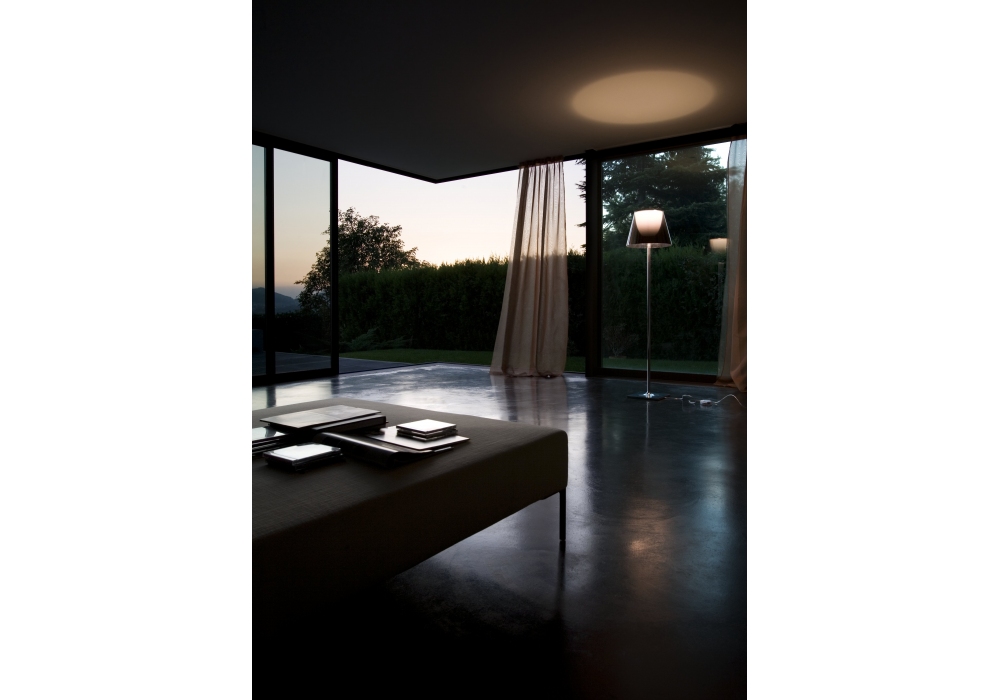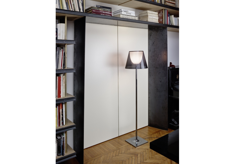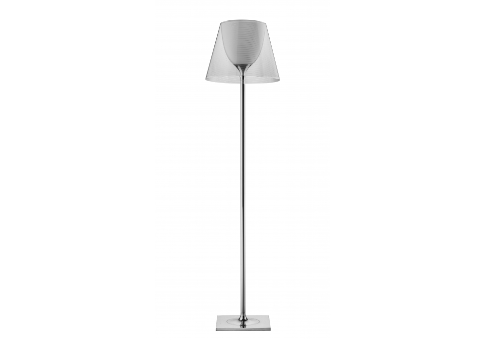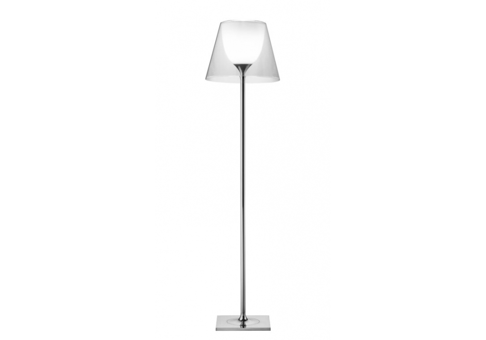 Ktribe F2 designed by Philippe Starck for Flos is a floor lamp with diffused light and a refined and modern design. The structure is composed of a base, a support rod and a diffuser support in die-cast, polished and chromed Zama alloy, with a base covered in galvanized steel sheet. The internal diffuser and the lamp holder support are made of injection-molded opal polycarbonate. The cable features an electronic dimmer that allows for step-by-step regulation of the light intensity. Bulb not included.