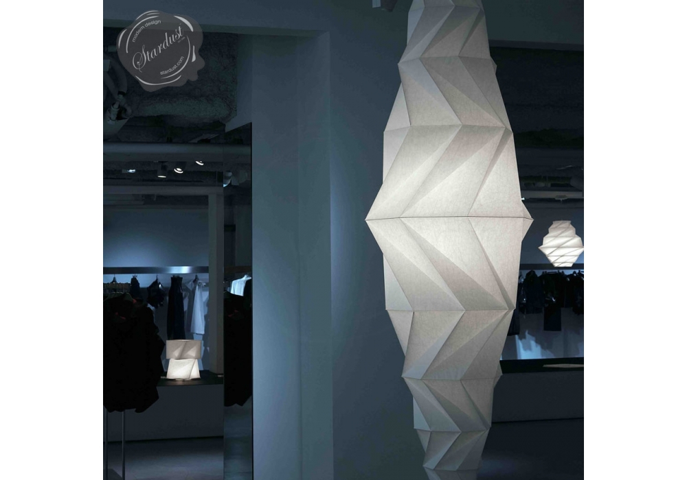 Minomushi designed by Issey Miyake + Reality Lab for Artemide is a floor lamp with quadrangular base and supporting structure in painted steel. The diffuser is structured by geometric shapes broken down in semi-transparent white plastic material and shields the dimmable LED light sources.
