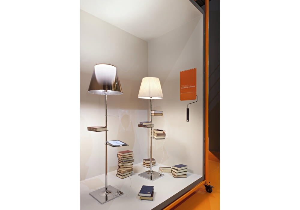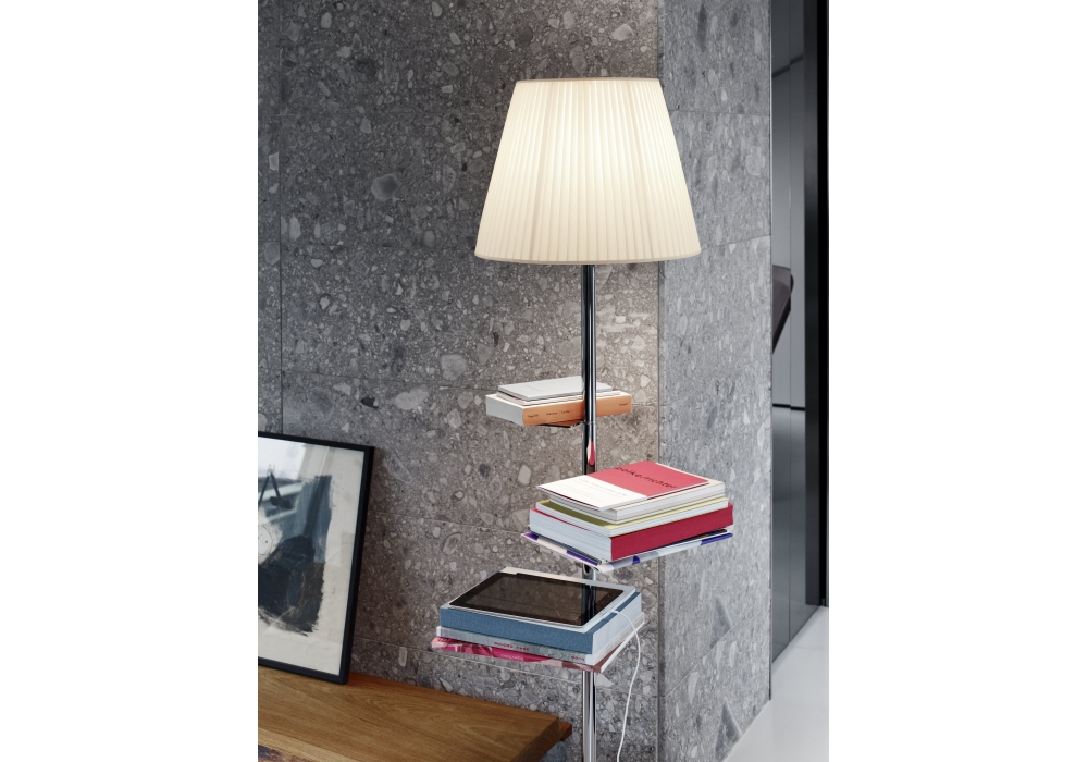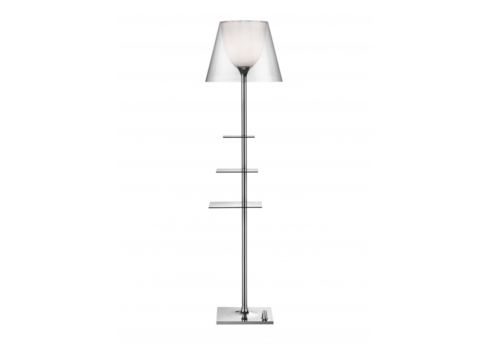 Bibliotheque Nationale designed by Philippe Starck for Flos is a floor lamp with diffused light with a chromed zamak structure and a galvanized steel base. Internal diffuser in opaline polycarbonate and external diffusers available in various materials and finishes. Equipped with shelves in polished stainless steel and a USB socket for charging mobile devices. Integrated dimmer. Bulb not included.