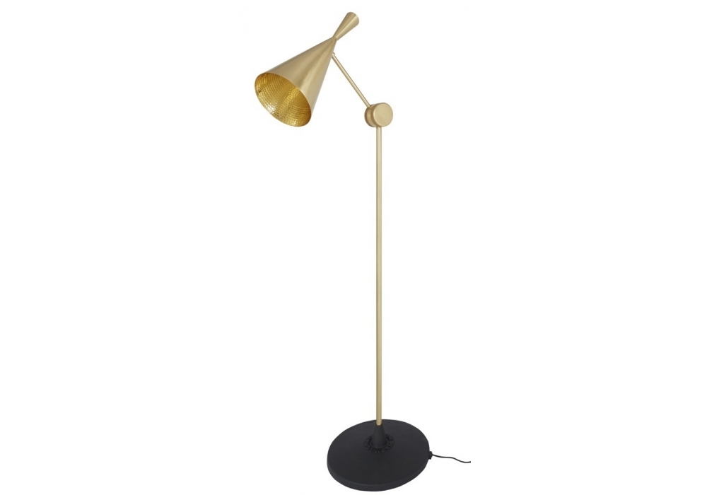 Beat Floor designed by Tom Dixon is a floor lamp with cast iron base and brass lampshade. Available in the following colors: black and brass. Black fabric cable with foot switch.