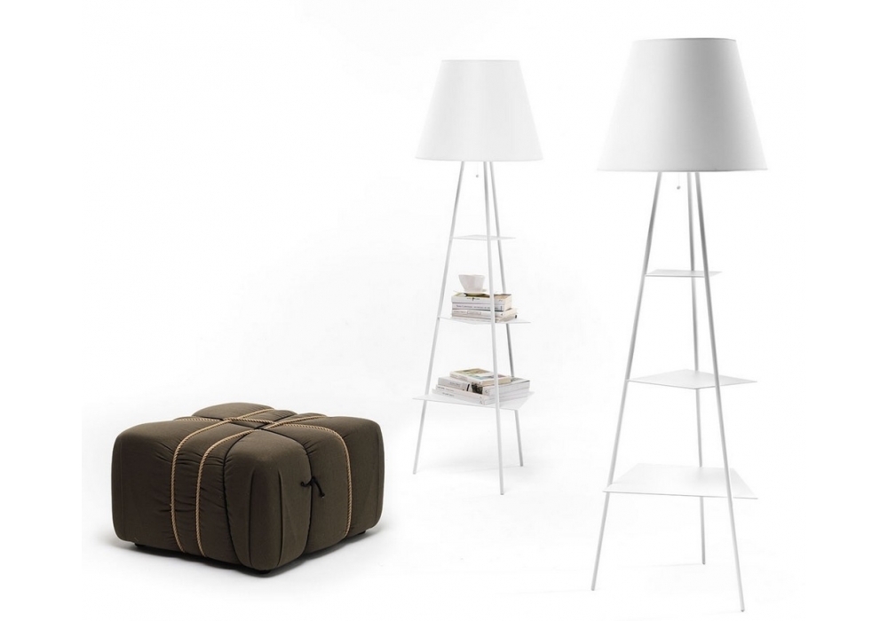 Tri.Be.Ca designed by Marzia & Leo Dainelli for Mogg is a floor lamp made of matt painted metal with lampshade in cotton fabric. 12v USB socket located under the lower shelf. Available in white or black.
