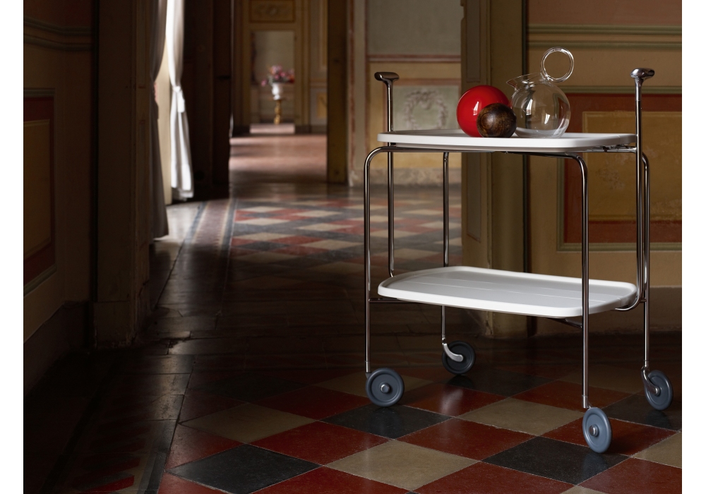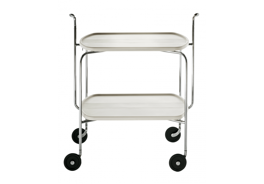 Transit designed by David Mellor for Magis is a folding trolley with a chromed steel tube structure. White polypropylene shelves.
