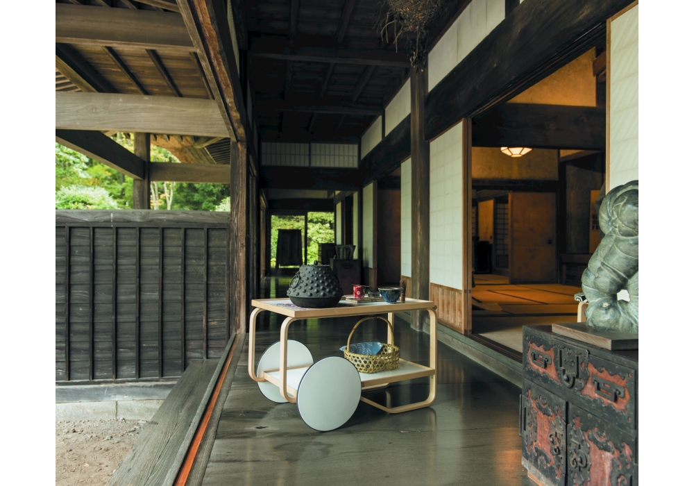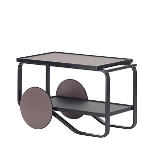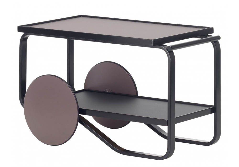 Tea Trolley 901 designed by Alvar Aalto for Artek is a trolley made with form-bent solid birch lamella frame and MDF wheels. Available in different finishes.
