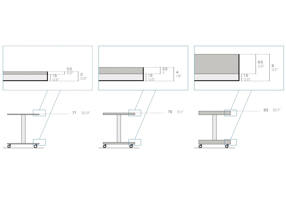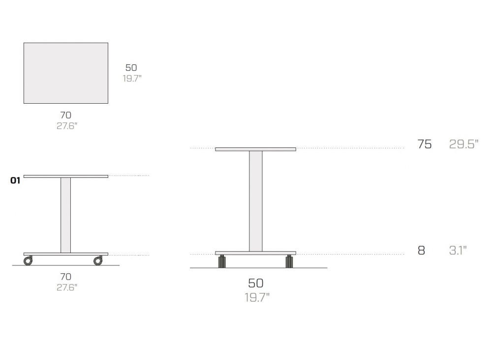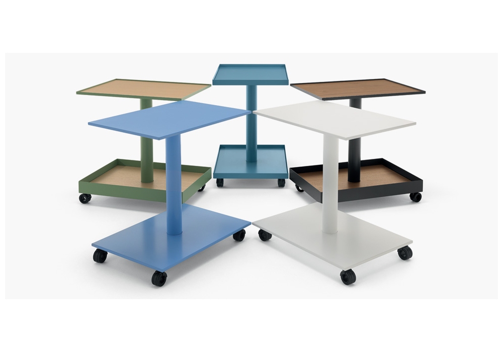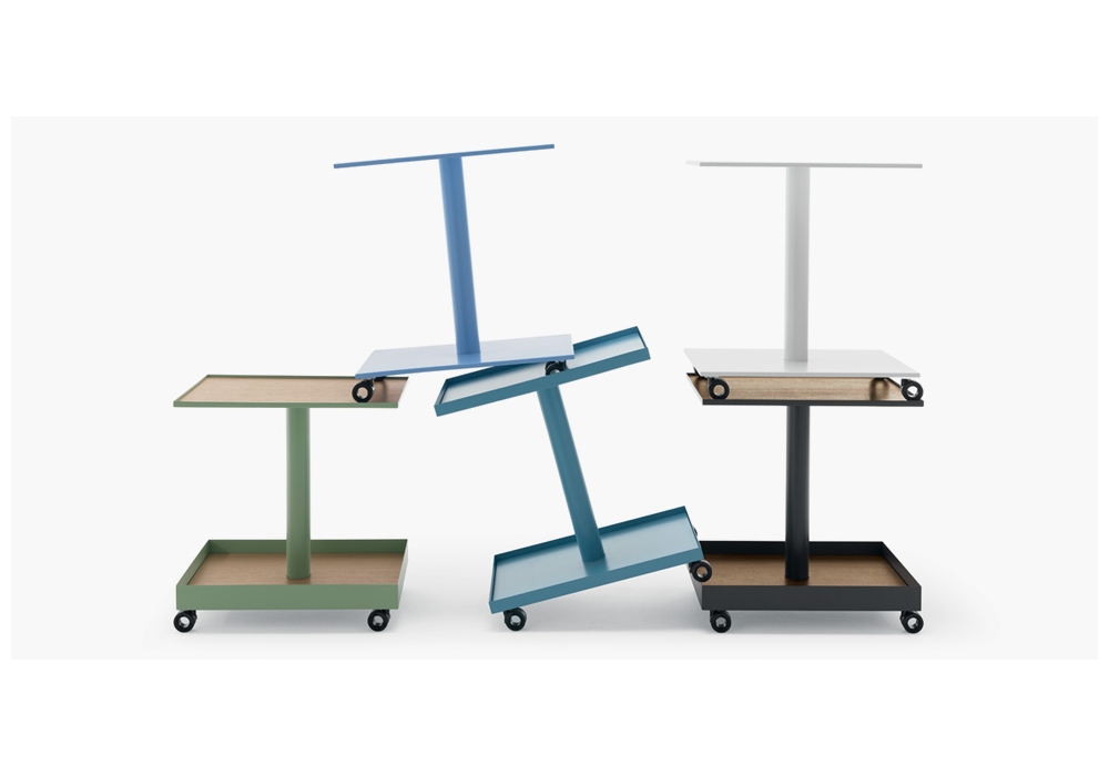 Pillar designed by Salvatore Indriolo for Fantin is a trolley made up of four wheels, two shelves and a sturdy supporting column. Top in sheet metal available in different finishes or in wood (only with sides). Upper and lower sides available in three heights.